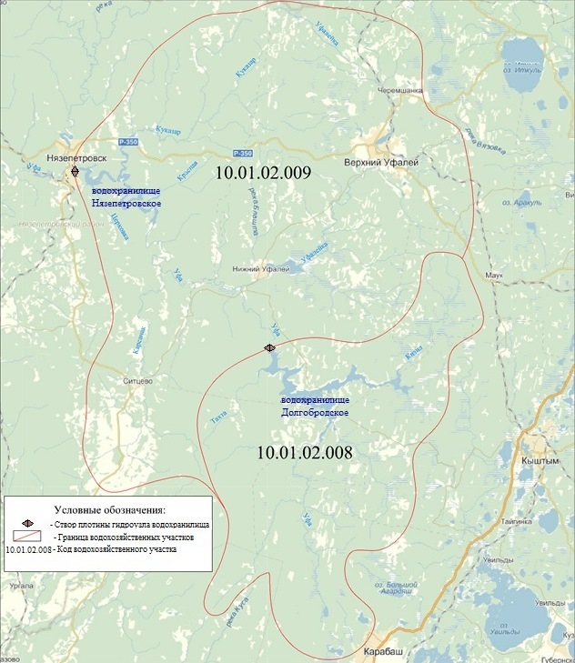 4. Долгобродское водохранилище расположено на территории Челябинской области в 864 км от устья р. Уфы и в 15 км ниже устья р. Тахты, южнее поселка городского типа Нижний Уфалей. Долгобродское водохранилище является верхним в каскаде с Нязепетровским водохранилищем на р. Уфе.