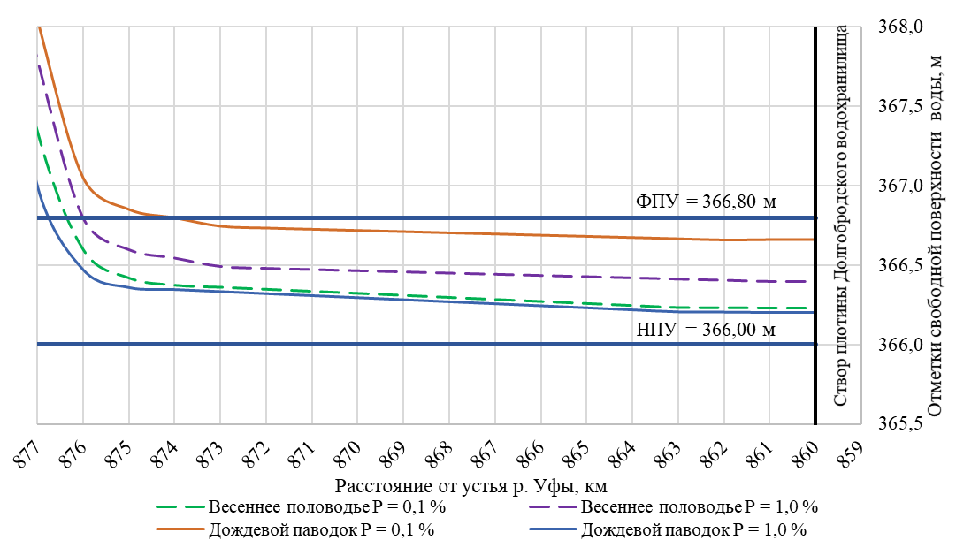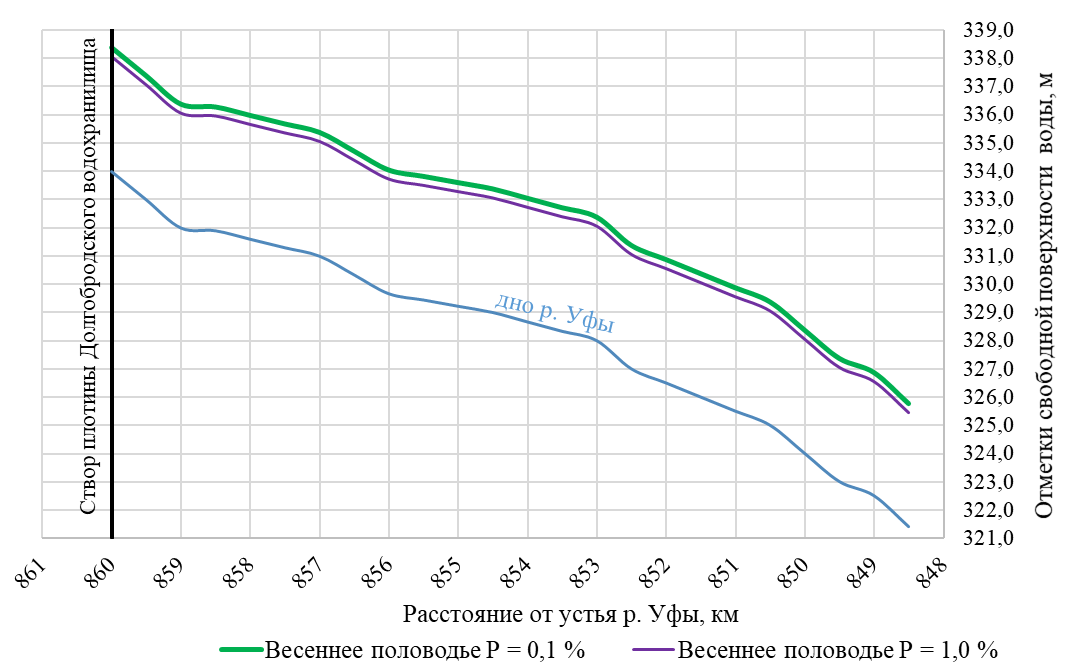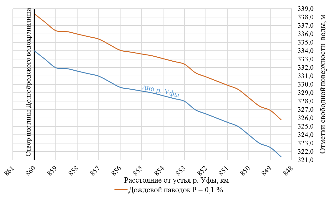 Продольный профиль кривой свободной поверхности р. Уфы в нижнем бьефе гидроузла водохранилища при прохождении максимальных расходов воды дождевого паводка расчетной обеспеченности 0,1%