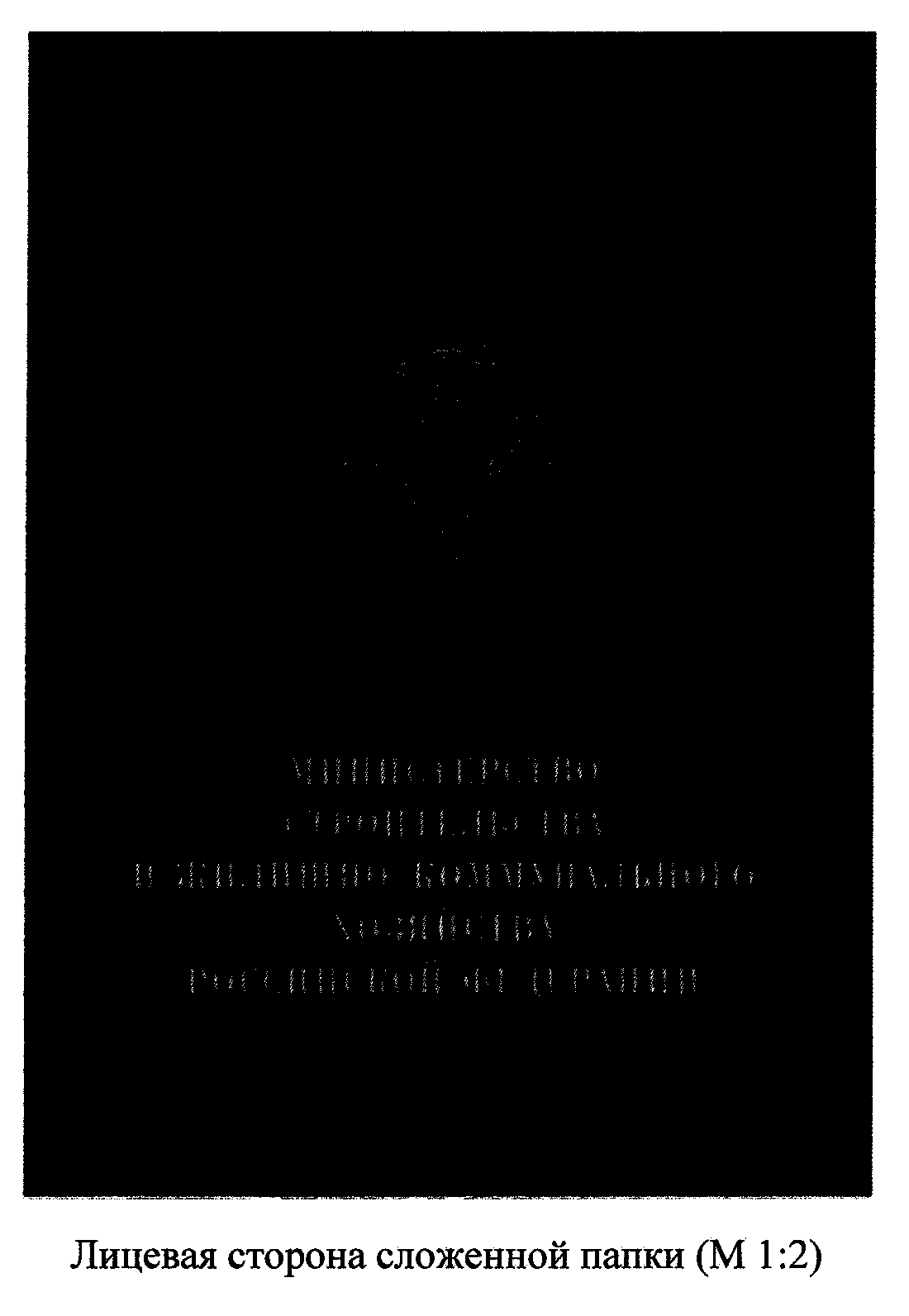 На лицевой стороне в верхней половине папки по центру изображен золотистого цвета геральдический знак - эмблема Министерства строительства и жилищно-коммунального хозяйства Российской Федерации.