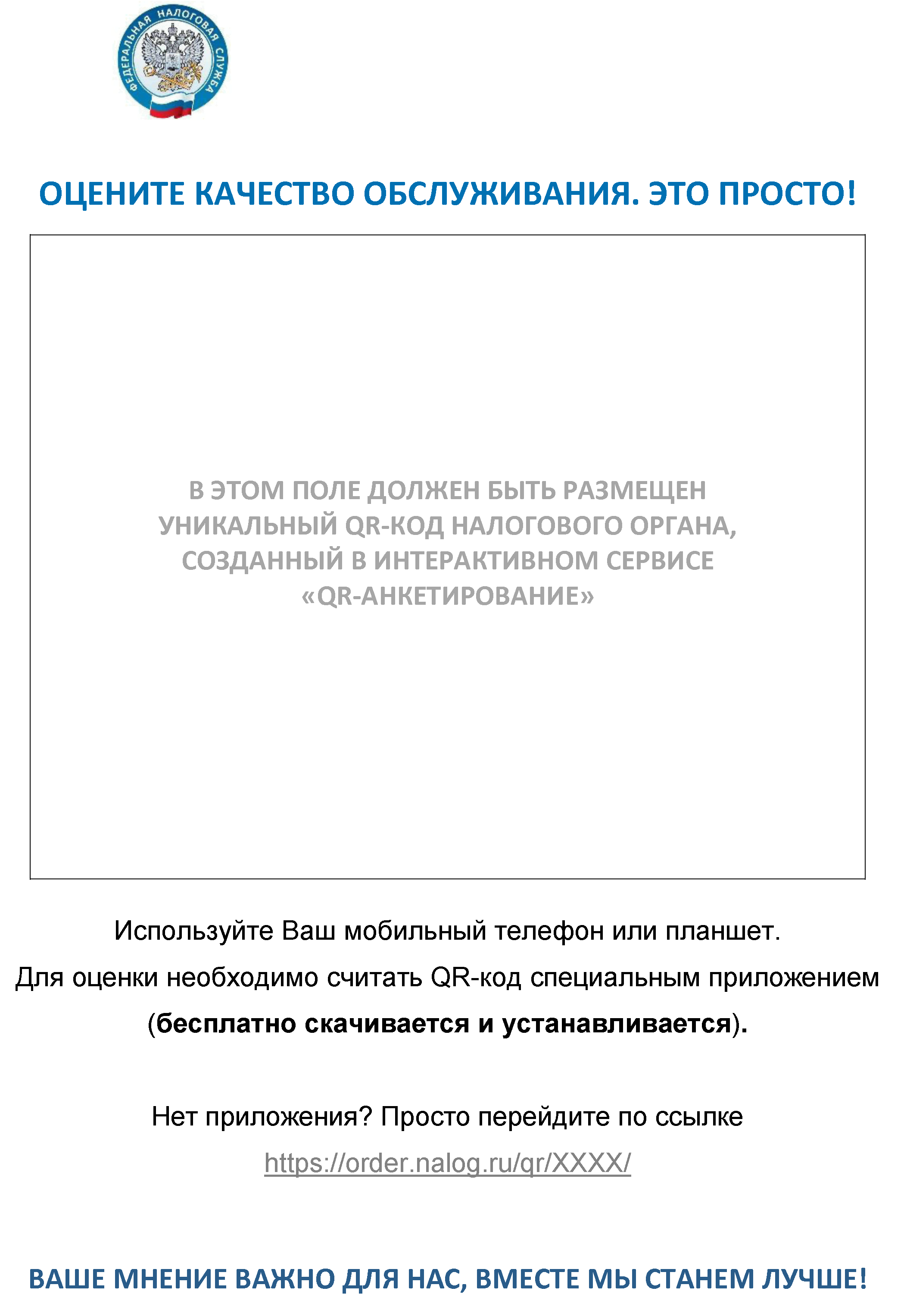3.10. В шаблон информационного плаката с предложением оценки качества обслуживания, сотрудником налогового органа вместо ссылки https://order.nalog.ru/qr/ХХХХ/ вводится, размещенная в Сервисе "ссылка на инспекцию", где вместо символов "ХХХХ" в тексте ссылки указан уникальный номер налогового органа.