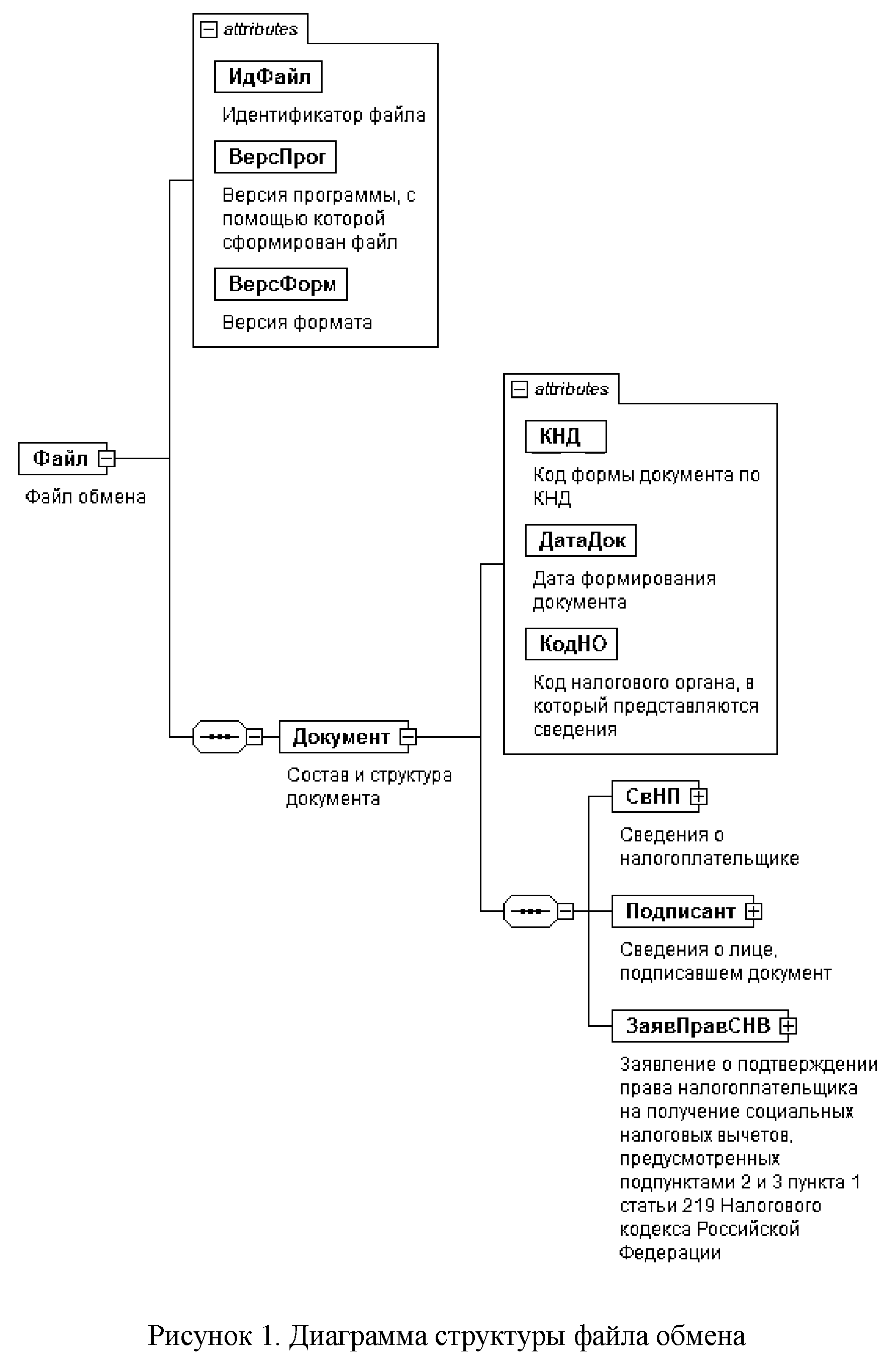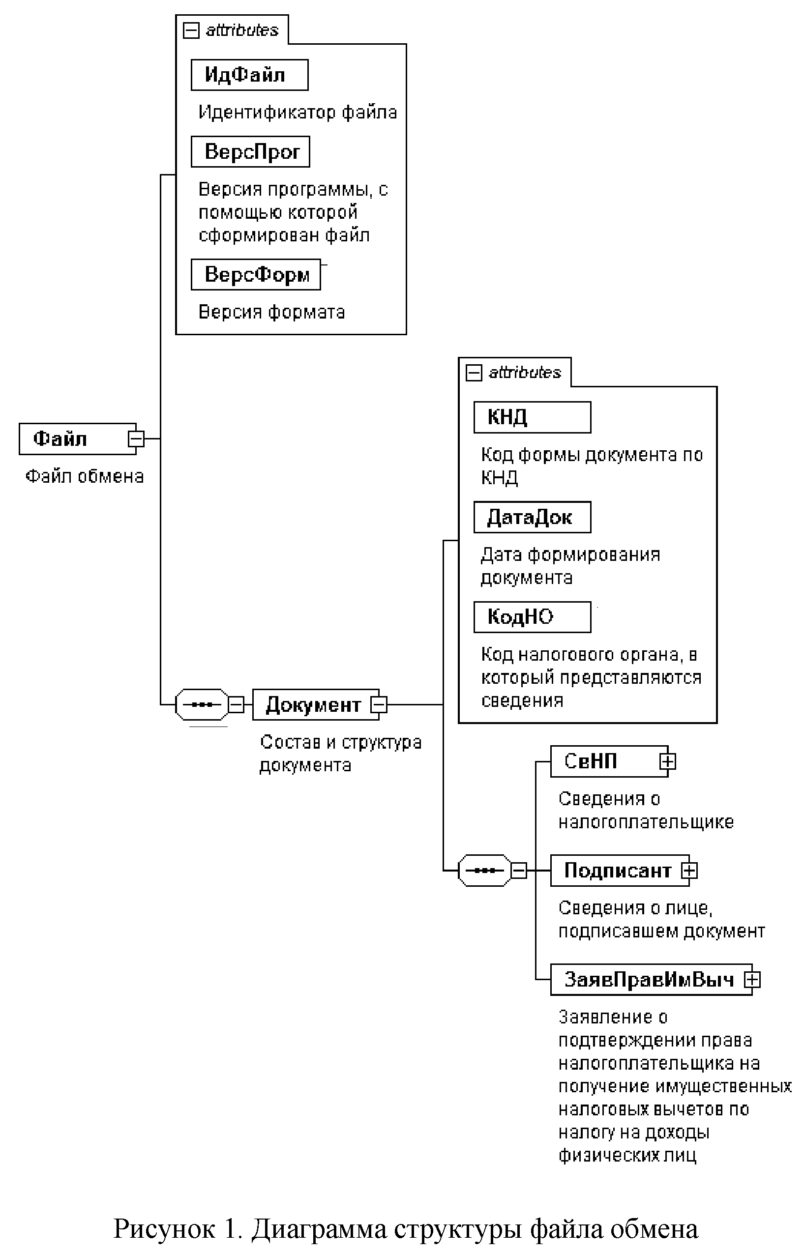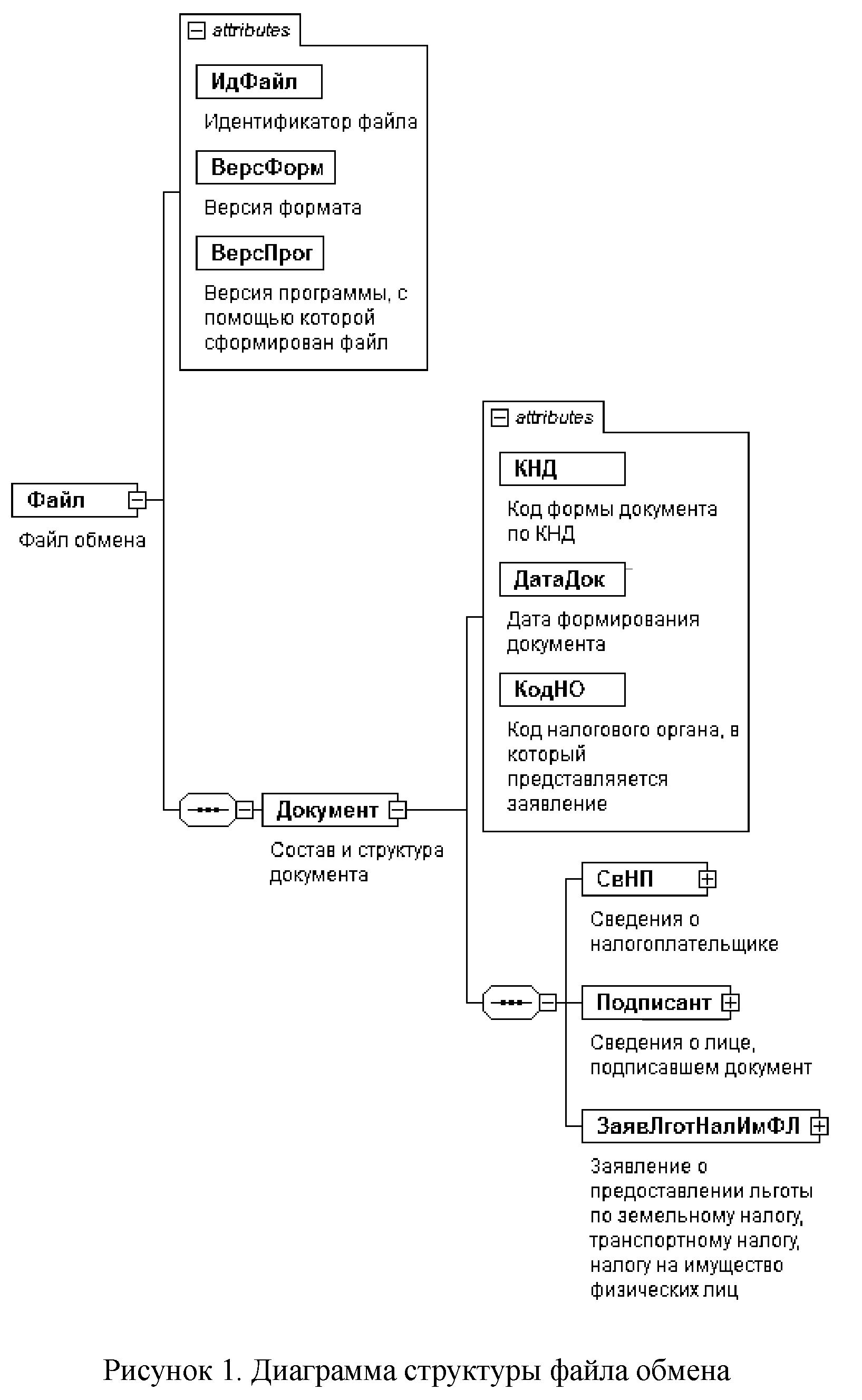 4. Логическая модель файла обмена представлена в виде диаграммы структуры файла обмена на рисунке 1 настоящего формата. Элементами логической модели файла обмена являются элементы и атрибуты XML файла. Перечень структурных элементов логической модели файла обмена и сведения о них приведены в таблицах 4.1 - 4.10 настоящего формата.