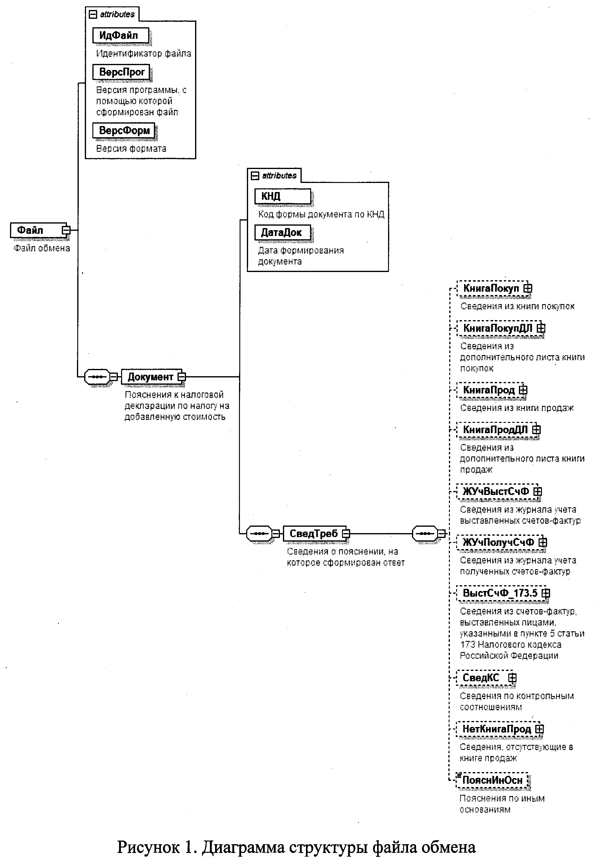 4. Логическая модель файла обмена представлена в виде диаграммы структуры файла обмена на рисунке 1 настоящего формата. Элементами логической модели файла обмена являются элементы и атрибуты XML файла. Перечень структурных элементов логической модели файла обмена и сведения о них приведены в таблицах 4.1 - 4.68 настоящего формата.