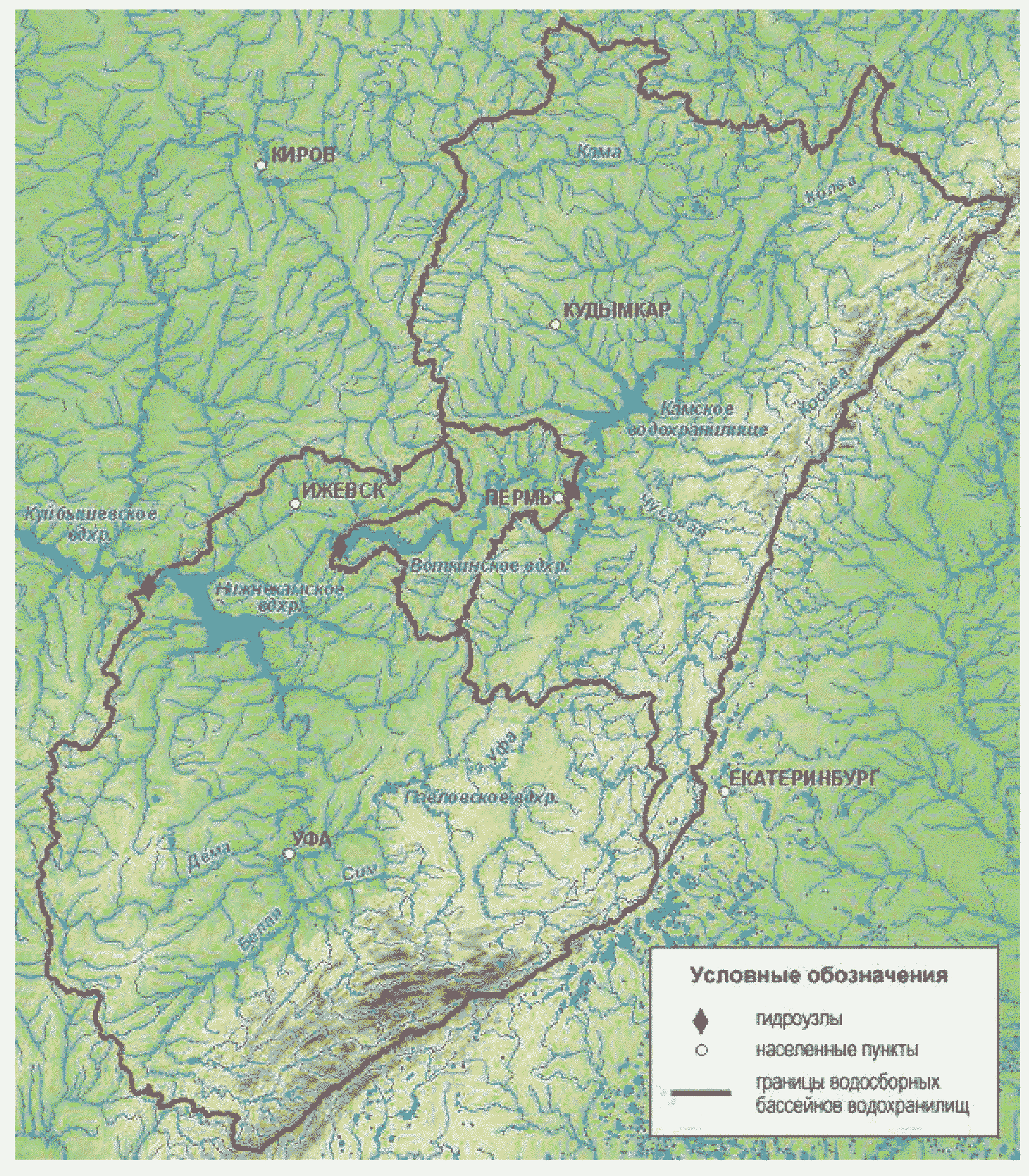 Водосборные бассейны Камского и Воткинского водохранилищ расположены на востоке Европейской части России и включают в себя восточную окраину Русской равнины и западную часть Уральских гор.