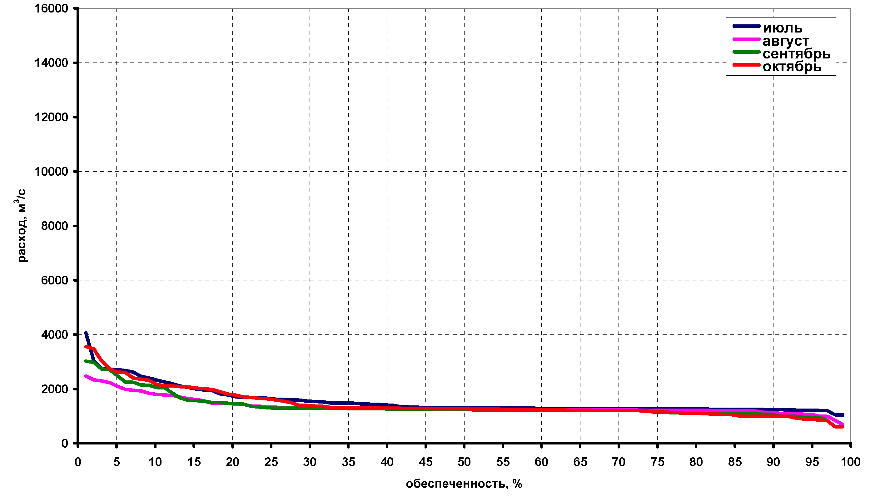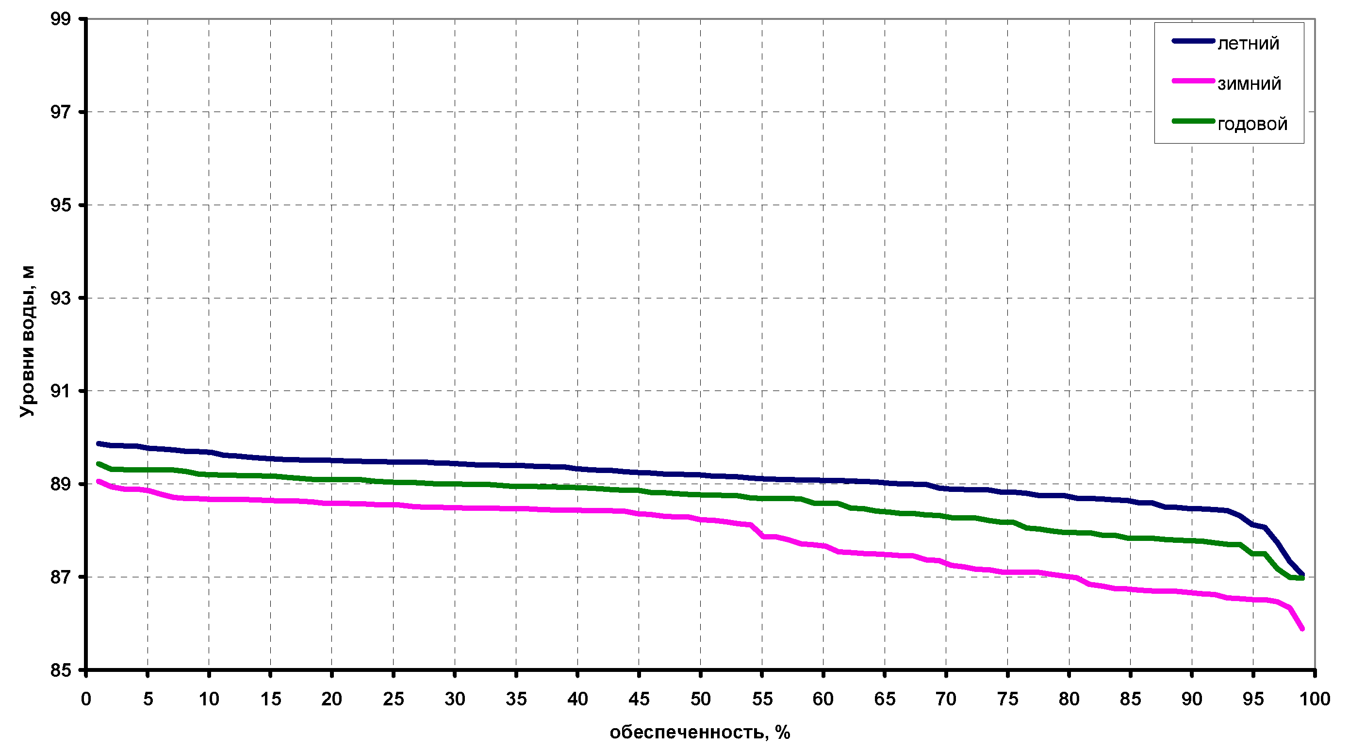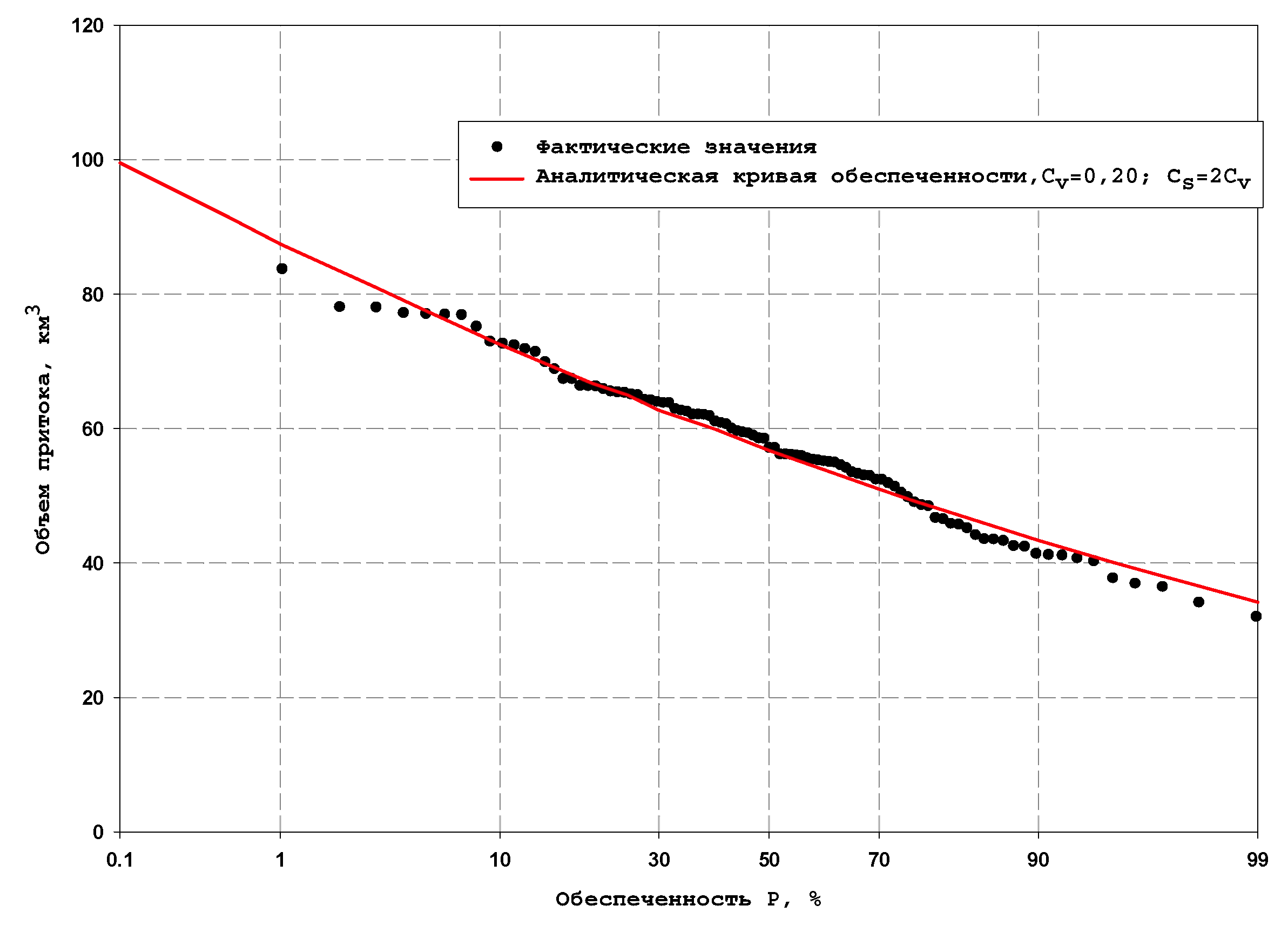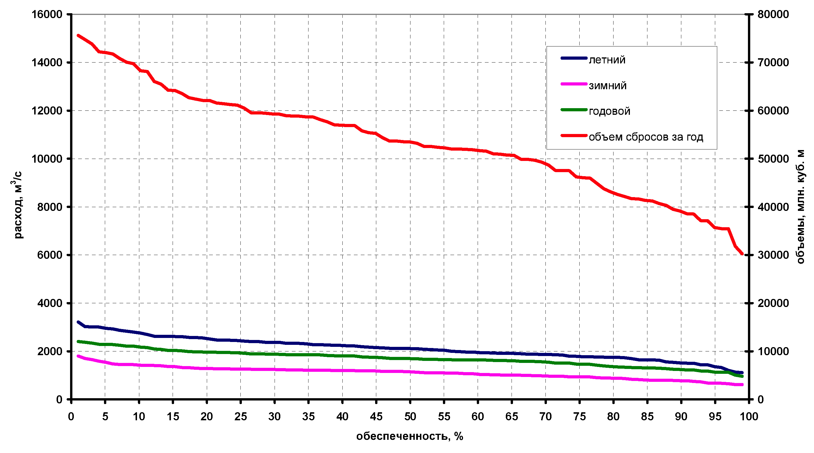 Обеспеченность объемов суммарного годового стока в створе Воткинского гидроузла характеризуется следующими величинами: