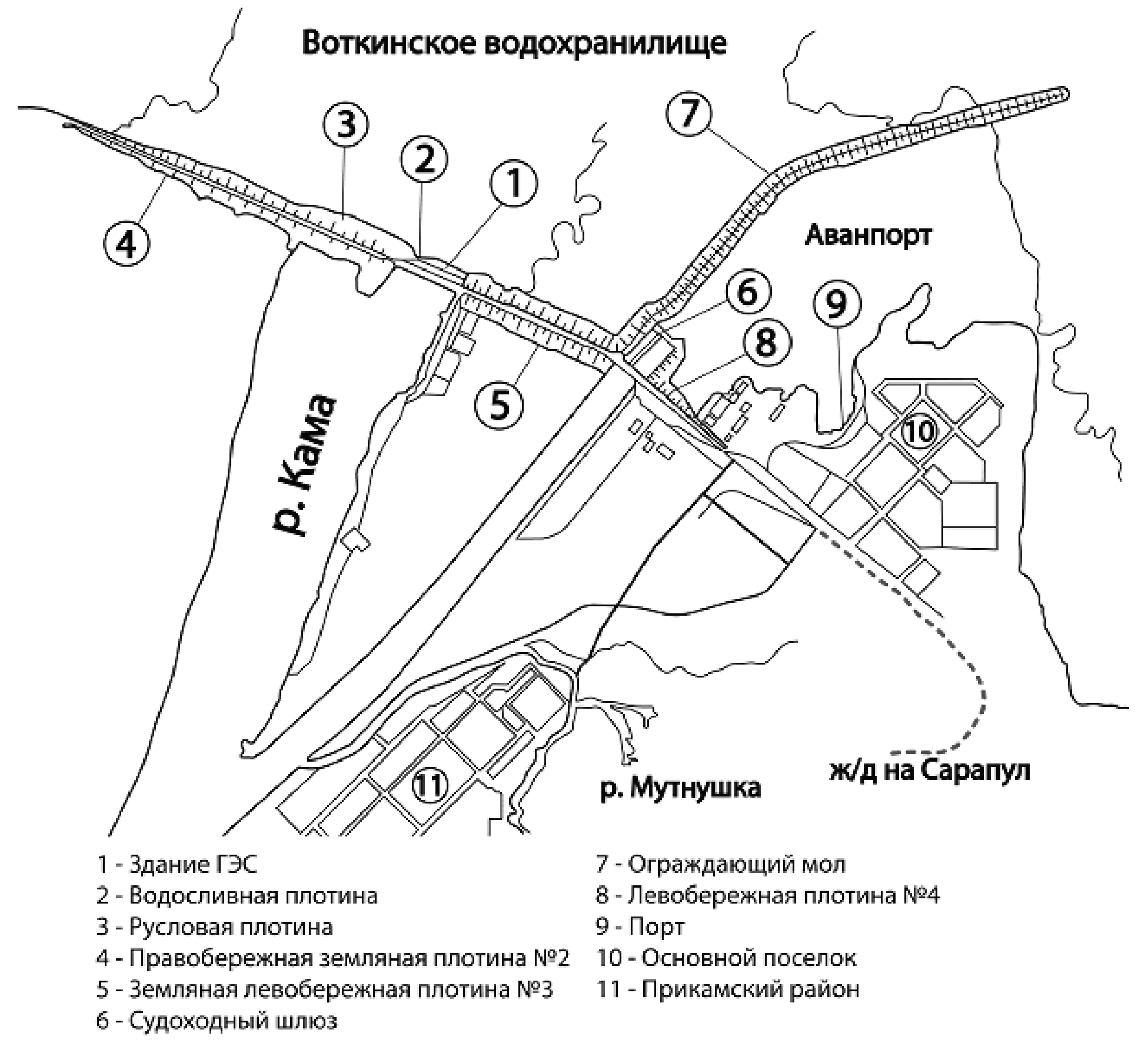 Воткинское водохранилище также образовано средненапорным гидроузлом, в состав сооружений которого входят бетонная водосливная плотина, ГЭС, грунтовые плотины, отводящий канал и судоходный шлюз.