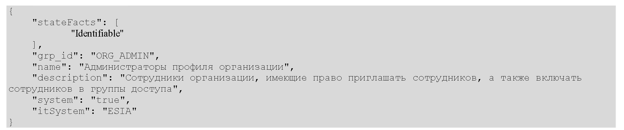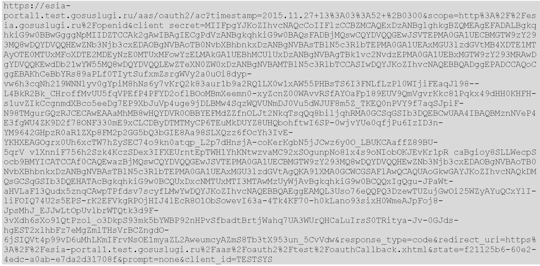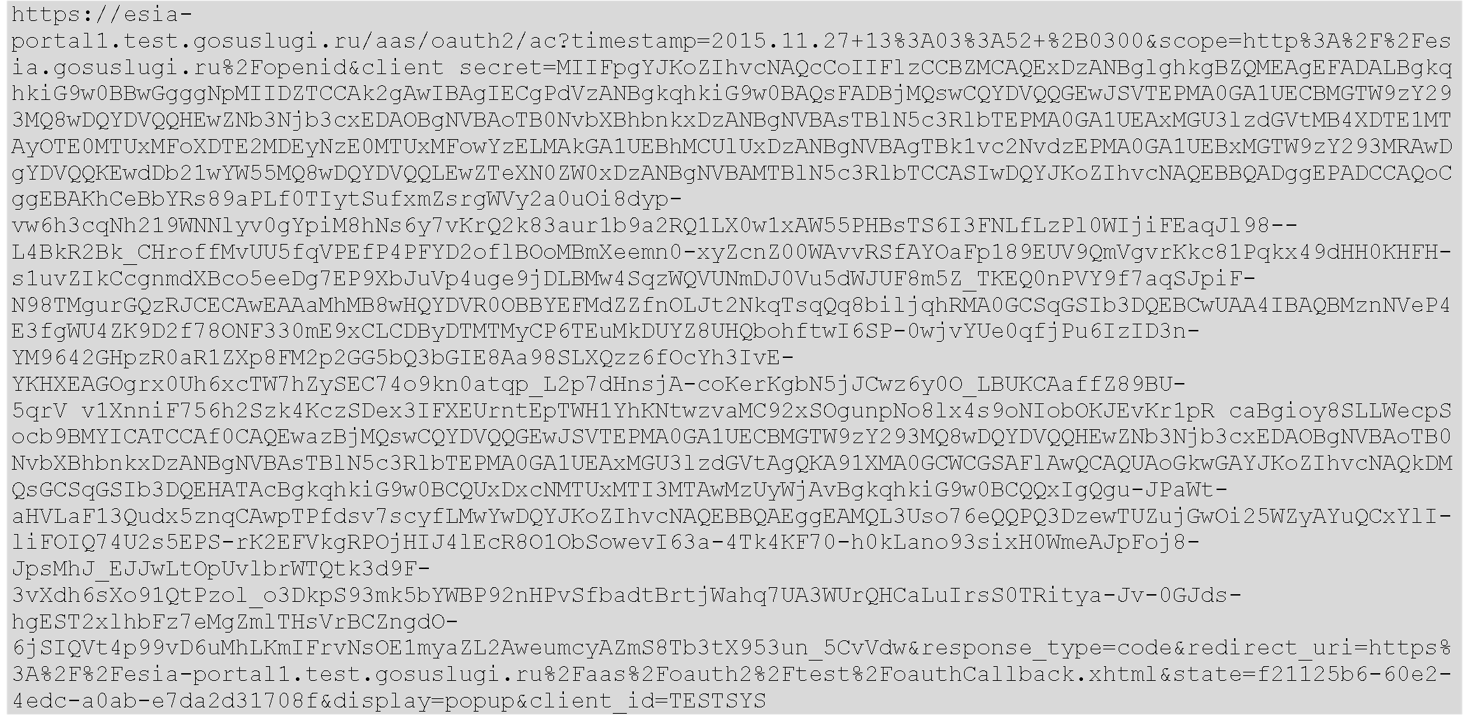 | 2.4 | - | - | Добавлено описание программного интерфейса на основе REST по получению данных о филиалах и ОГВ. Уточнено описание программного интерфейса на основе REST по получению данных о системных группах. Изменено обозначение типов учетных записей. Добавлены ссылки на Технологический портал ЕСИА. Уточнено описание redirect_uri при использовании сервиса авторизации ЕСИА на основе OAuth 2.0. Уточнено описание сервиса получения данных осубъекте (Приложение Б.7). Уточнен формат адреса, используемый в REST-сервисе ЕСИА |