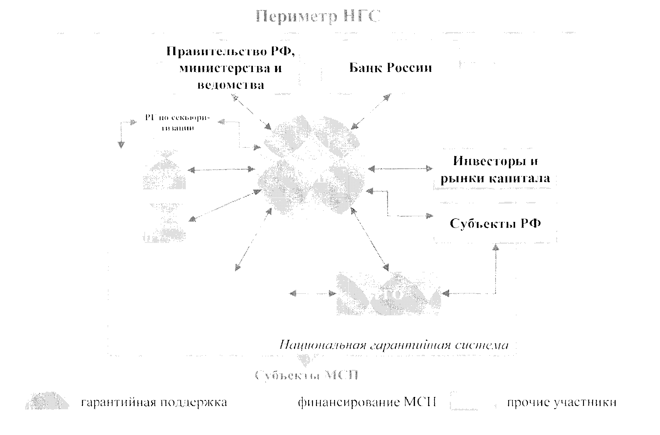 «Национальная гарантийная система (НГС) - трехуровневая система гарантийных организаций, включающая в себя акционерное общество «Федеральная корпорация по развитию малого и среднего предпринимательства» (далее - АО «Корпорация «МСП»), акционерное общество «Российский Банк поддержки малого и среднего предпринимательства» (далее - АО «МСП Банк») и региональные гарантийные организации (РГО), которые во взаимодействии друг с другом обеспечивают значимую и эффективную поддержку субъектам малого и среднего предпринимательства (далее - МСП), организациям, образующим инфраструктуру поддержки субъектов МСП (далее - организации инфраструктуры поддержки), специализированным финансовым обществам в рамках сделок секьюритизации на федеральном и региональном уровнях с помощью гарантий и поручительств, а также единых стандартов работы гарантийных организаций.»;