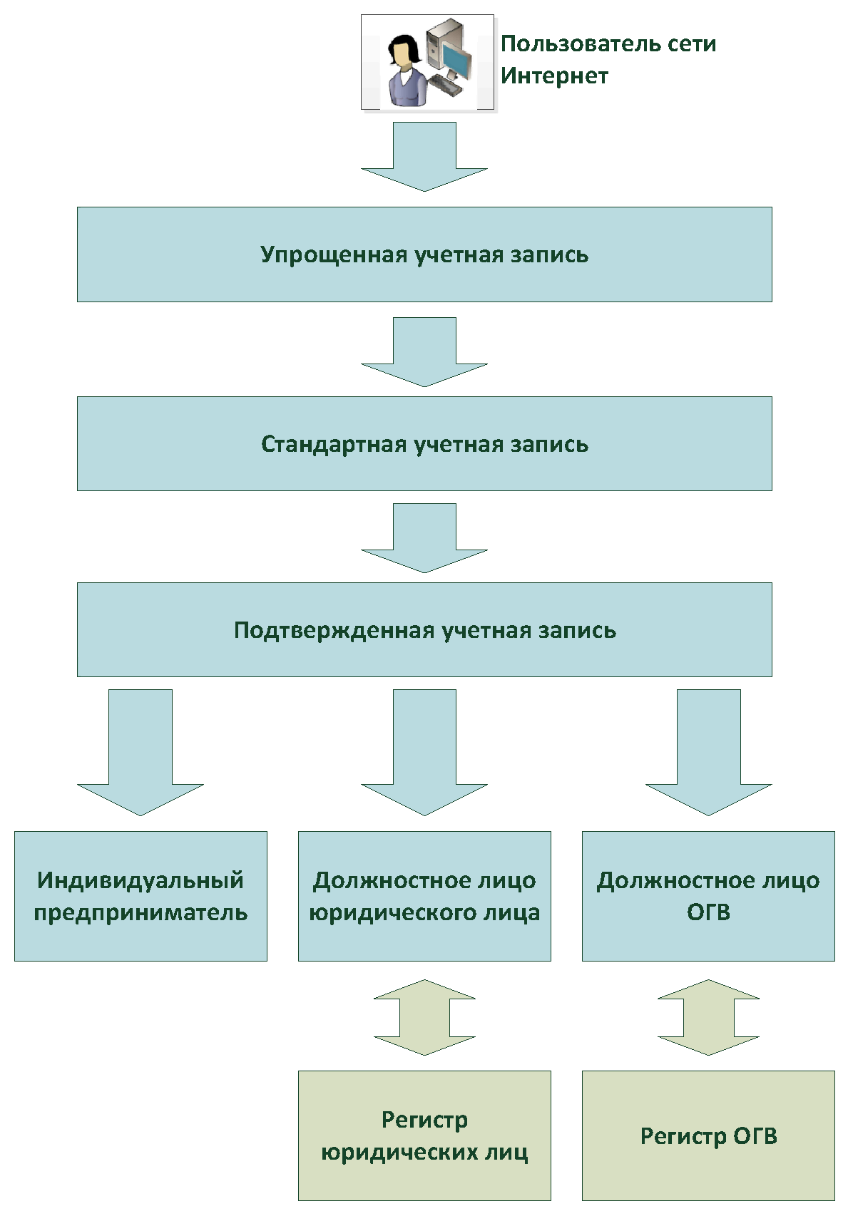 Чтобы подтвердить свою учетную запись, пользователь должен предварительно создать упрощенную (непроверенную) или стандартную (проверенную) учетную запись. Это может сделать любой пользователь, имеющий номер мобильного телефона или адрес электронной почты, используя веб-интерфейс ЕСИА. Подтвержденная учетная запись создается пользователем из упрощенной (непроверенной) учетной записи в результате успешной проверки личных данных пользователя в базовых государственных информационных ресурсах (СНИЛС, ФИО, паспортные данные и др.) и подтверждения личности одним из доступных способов, в частности, посредством обращения в один из Центров обслуживания.