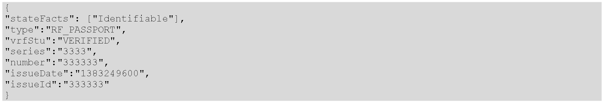 В качестве входных параметров метод, нацеленный на подтверждение личности, получает данные документа, удостоверяющего личность, а также ряд дополнительных параметров. В частности, может быть передан один из возможных типов контакта (email или mobile) для идентификации заявки на подтверждение учетной записи*(4).