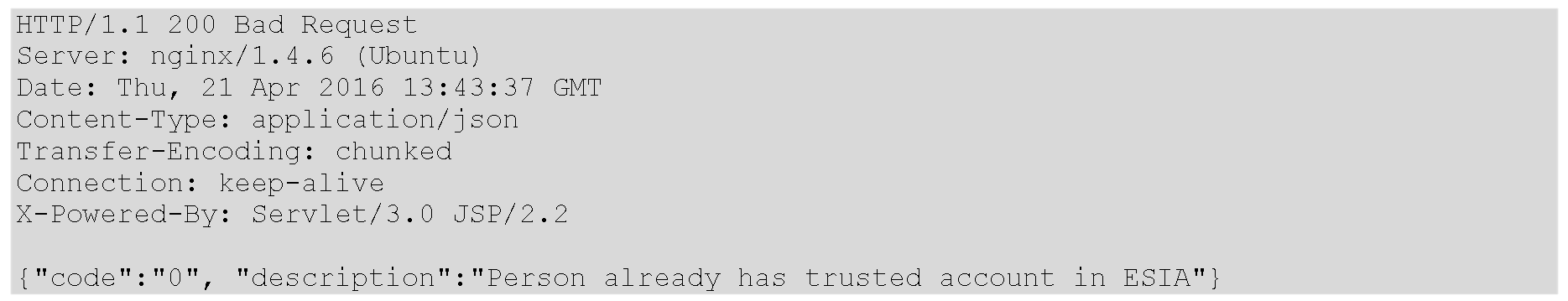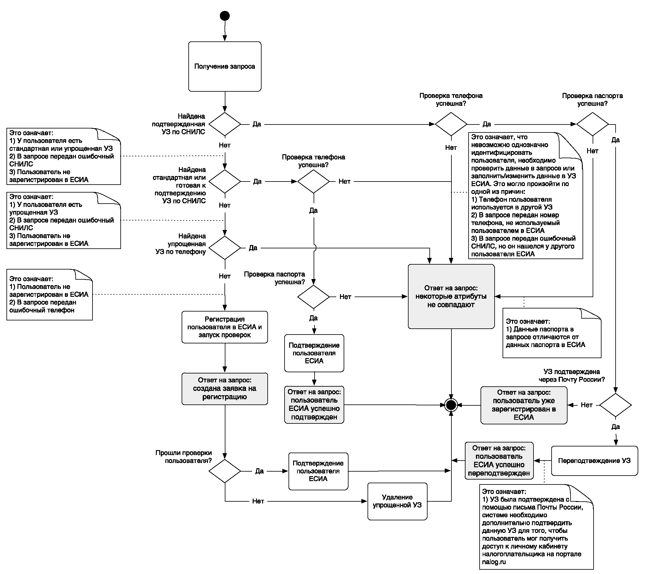 Если заявка на регистрацию создана успешно, ЕСИА направляет пользователю по указанным в запросе каналам связи уведомление об успехе проверки и возможности входа в учетную запись. Если данные пользователя не прошли проверку по БГИР (и в заявке указан e-mail и/или номер мобильного телефона), ЕСИА направляет пользователю уведомление об этом. Регистрация учётной записи, данные профиля которой не прошли проверку по БГИР, не производится.