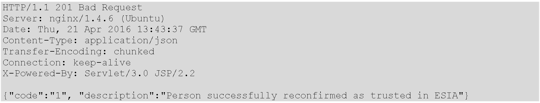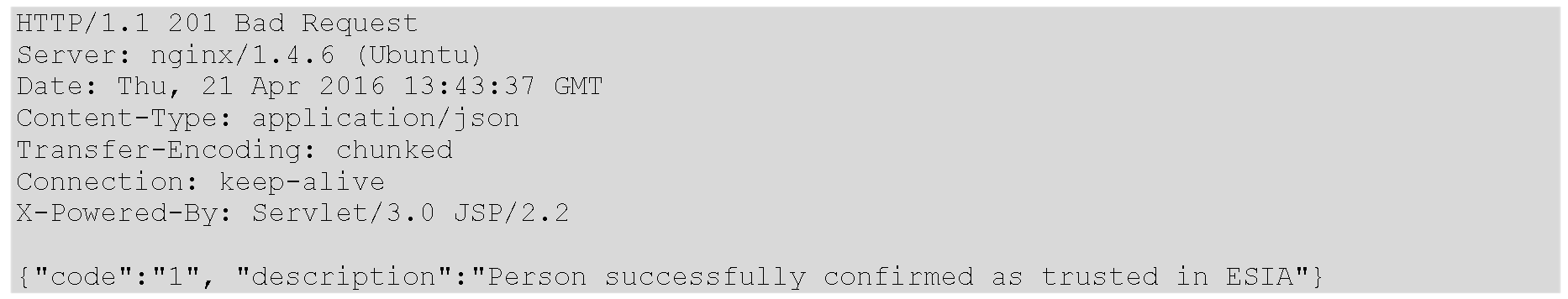 | 2. | Подтверждение учетной записи ЕСИА (пользователь заполнял заявку на подтверждение учетной записи, заявка проверена) | Вызов метода «Подтвердить личность гражданина РФ или иностранного гражданина в ЕСИА» сервиса ЕСИА |