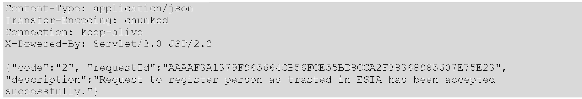 В качестве выходных параметров метод возвращает результат выполнения операции (успешно или не успешно). При успешном завершении в ответном сообщении содержится идентификатор заявки на регистрацию пользователя (requestId), поскольку верификация данных пользователя осуществляется в асинхронном режиме (в силу возможной недоступности БГИР ФОИВ для осуществления верификации персональных данных пользователей).