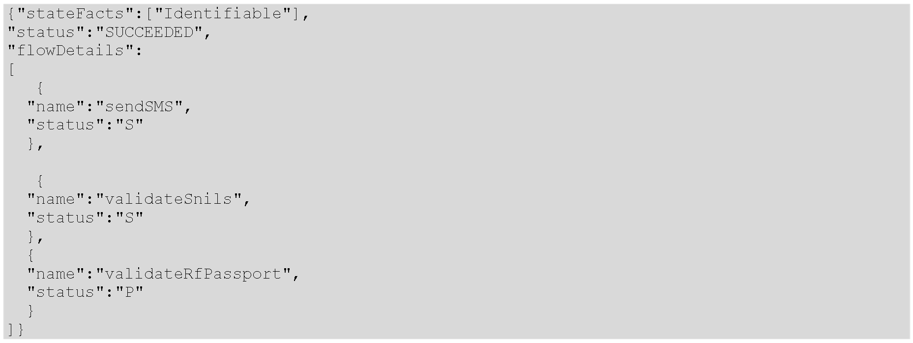 В качестве выходных параметров метод возвращает статус выполнения операции (успешно или не успешно), идентификатор заявки на идентификацию пользователя и проверку его данных (requestId), поскольку проверка данных пользователя осуществляется в асинхронном режиме