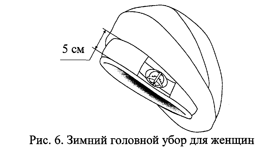 2.6. Зимний головной убор для женщин (рис. 6) представляет собой меховой берет с околышем и боковой пряжкой с наложенным на нее стилизованным изображением пассажирского самолета золотистого цвета. Высота околыша 5 см.
