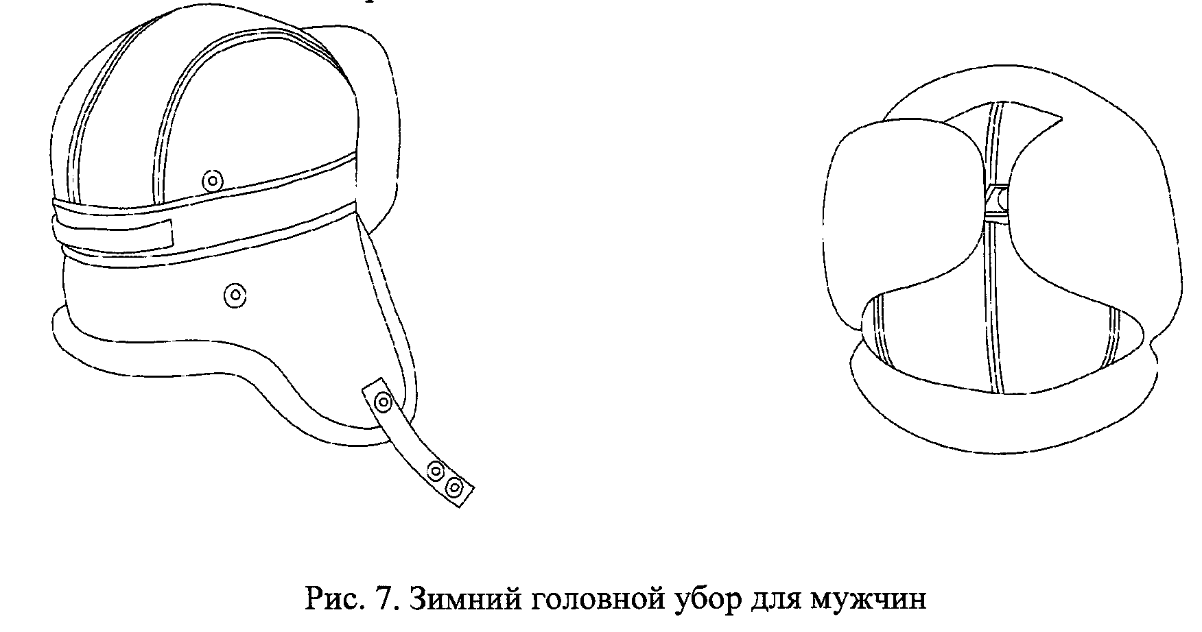 2.7. Зимний головной убор для мужчин (рис. 7) состоит из черного мехового околыша, колпака, тульи, козырька и назатыльника. Колпак, тулья, а также подкладки козырька и назатыльника - из черной кожи. Назатыльник и наушники могут опускаться и застегиваться под подбородком.