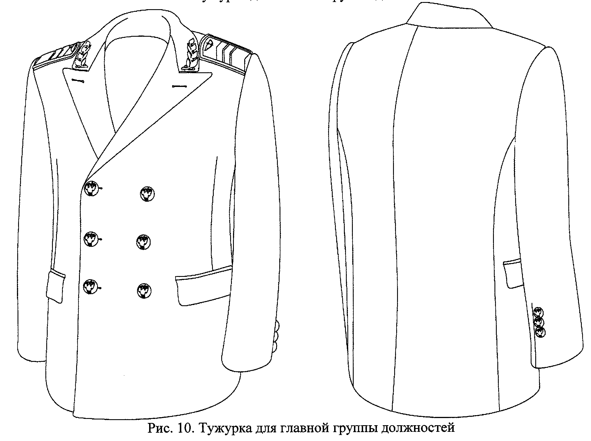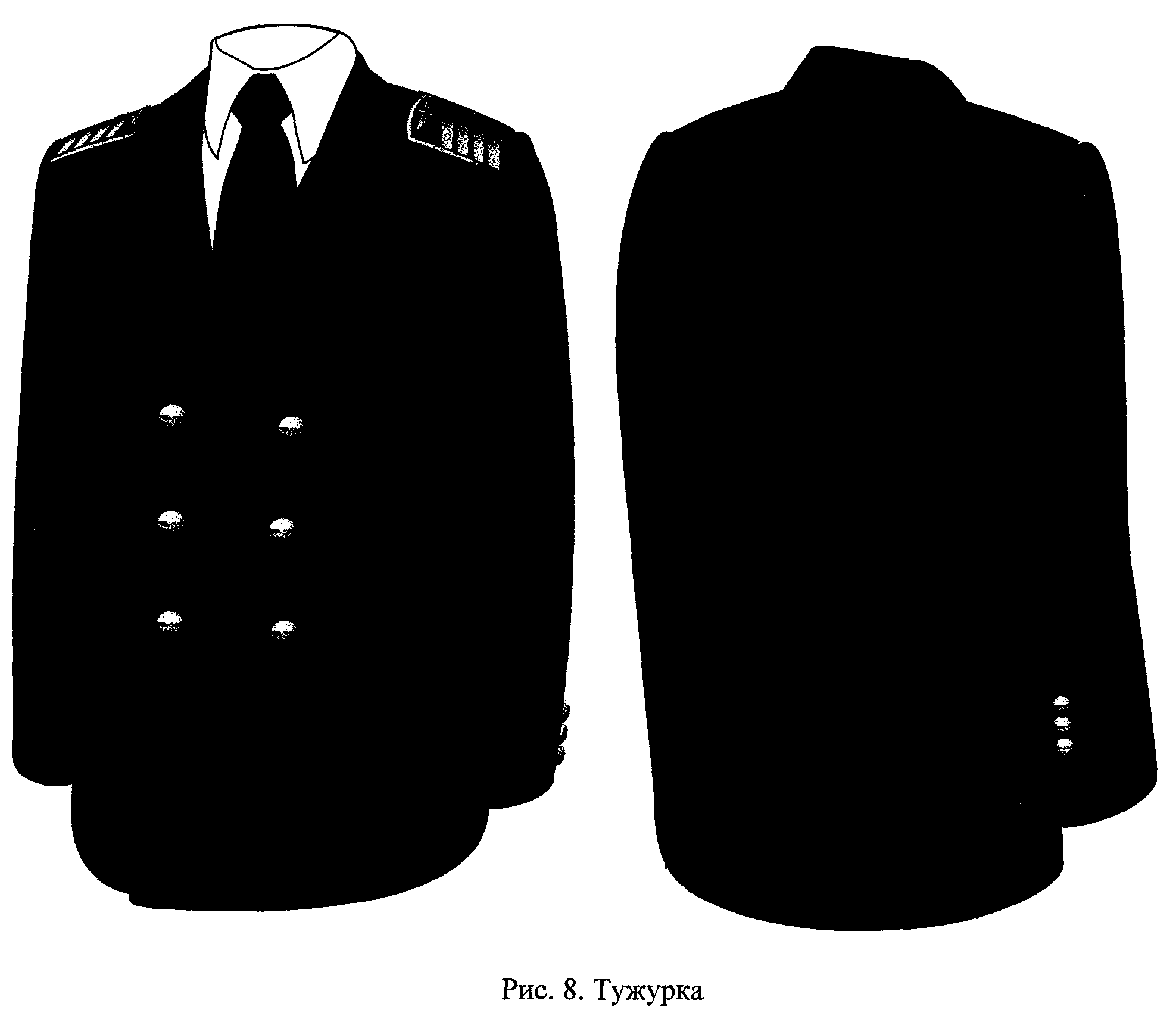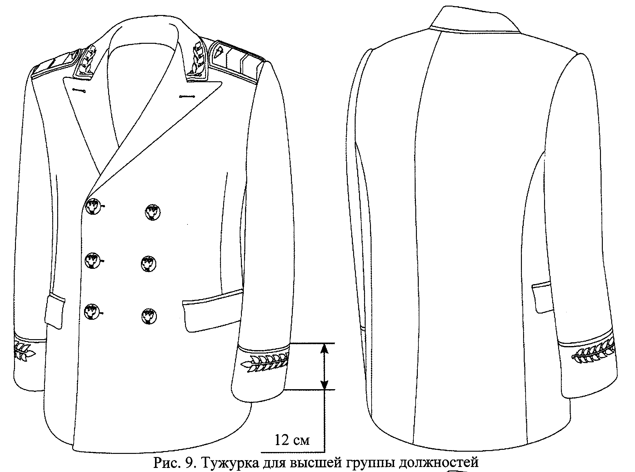 2.8. Тужурка (рис. 8) шерстяная двубортная синего (белого) цвета имеет прямой покрой, лацканы заостренной формы, два боковых прорезных кармана с клапанами прямоугольной формы и застегивается на три пуговицы. Рукава тужурки для высшей группы должностей имеют обшлаги, для остальных групп - ложные шлицы с тремя малыми пуговицами на каждой (рис. 9, 10, 11). Ширина обшлагов 12 см. Высота шлицы 11 см. Ширина воротника 4,75 см. Вынос лацкана 6 см.