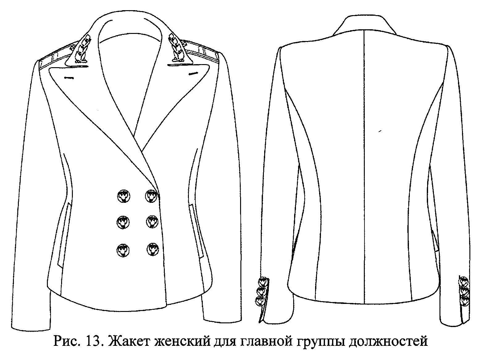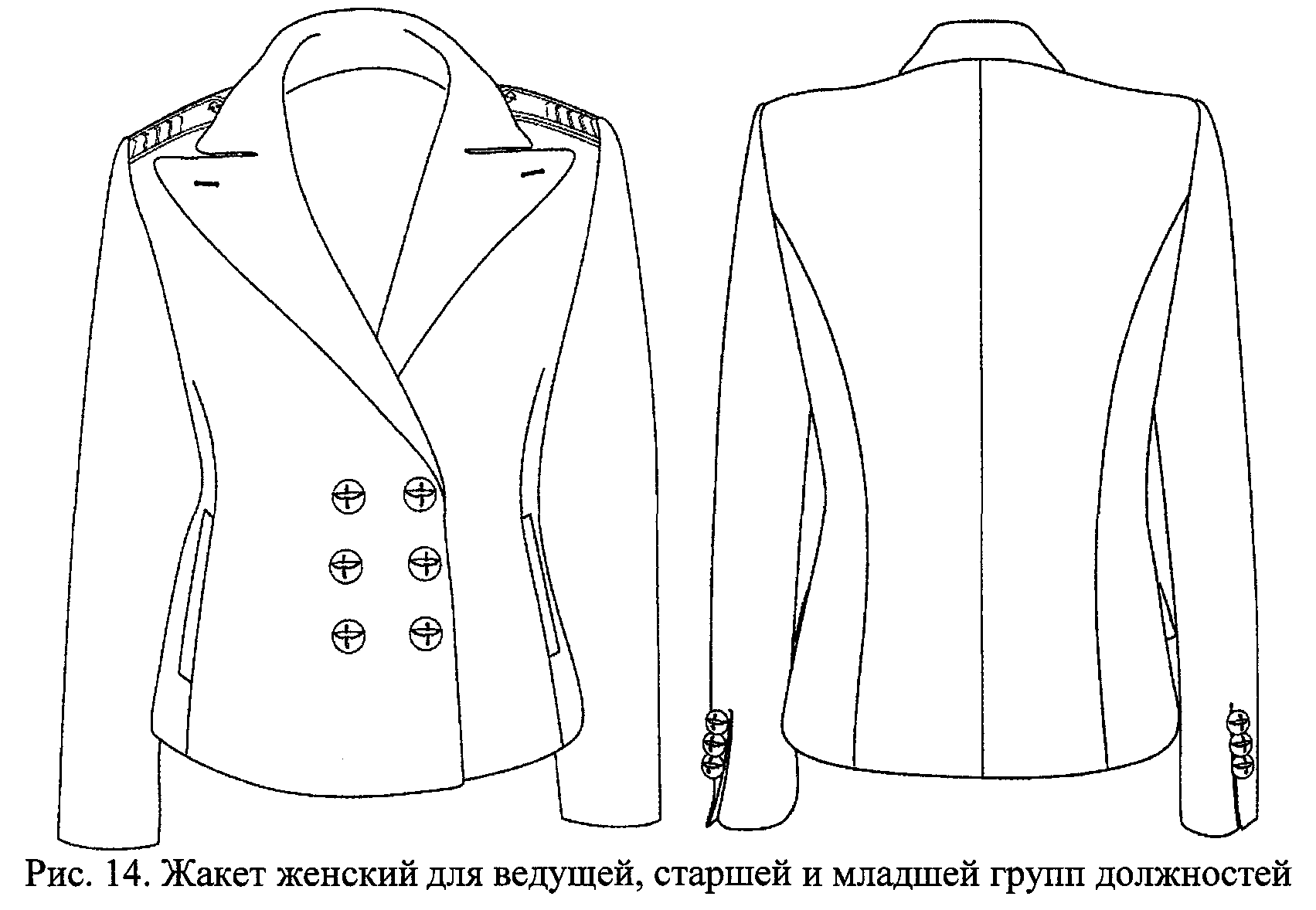 2.9. Жакет женский - шерстяной двубортный синего (белого) цвета имеет приталенный покрой, лацканы заостренной формы, два боковых прорезных кармана без клапанов и застегивается на три пуговицы. Рукава жакета для высшей группы должностей имеют обшлаги, для остальных групп - ложные шлицы с тремя малыми пуговицами на каждой (рис. 12, 13, 14).