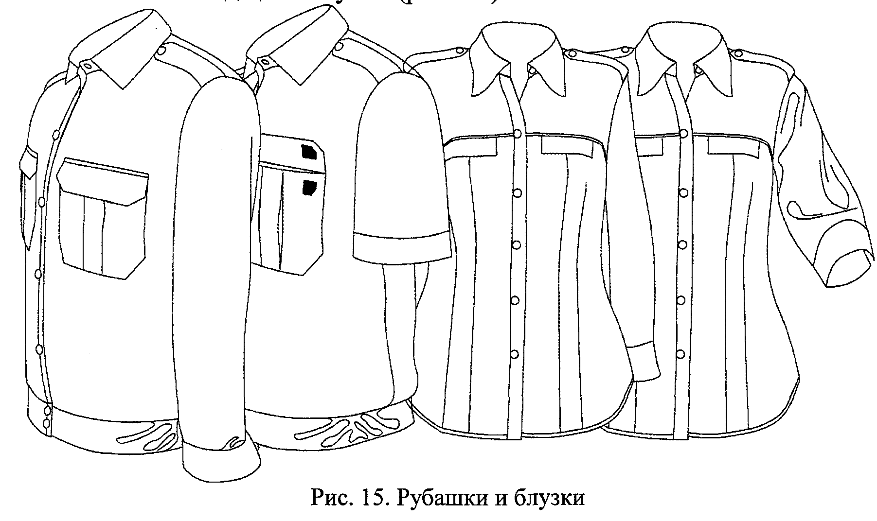 2.13. Блузка женская белая приталенного покроя имеет стояче-отложной воротник, ложные нагрудные карманы и погончики из той же ткани. Пуговицы гладкие пластиковые под цвет блузки (рис. 15).