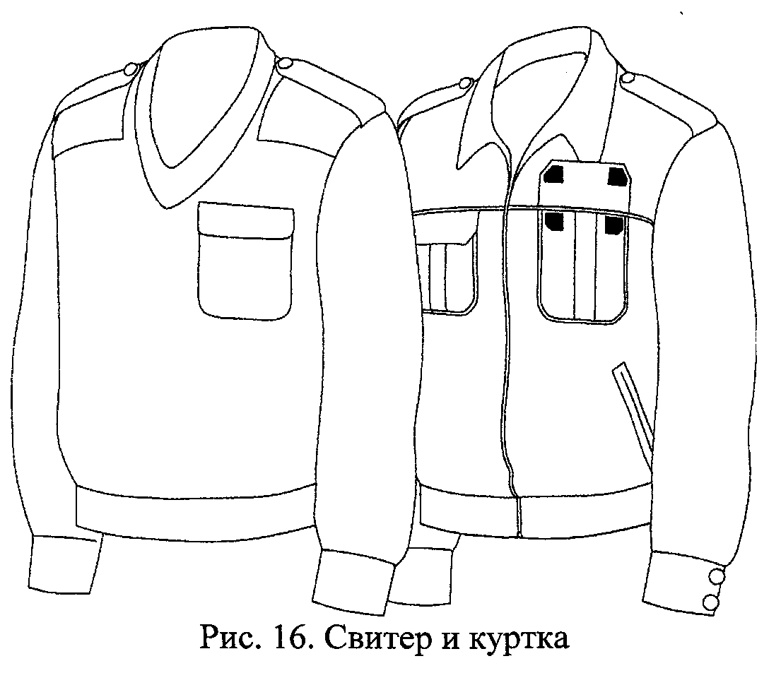 2.14. Свитер синий шерстяной свободного покроя с вырезом под галстук имеет пояс на резинке, манжеты-резинки, накладной нагрудный карман, усилительные накладки на плечах и локтях и погончики. Карман, накладки и погончики - из ткани синего цвета (рис. 16).