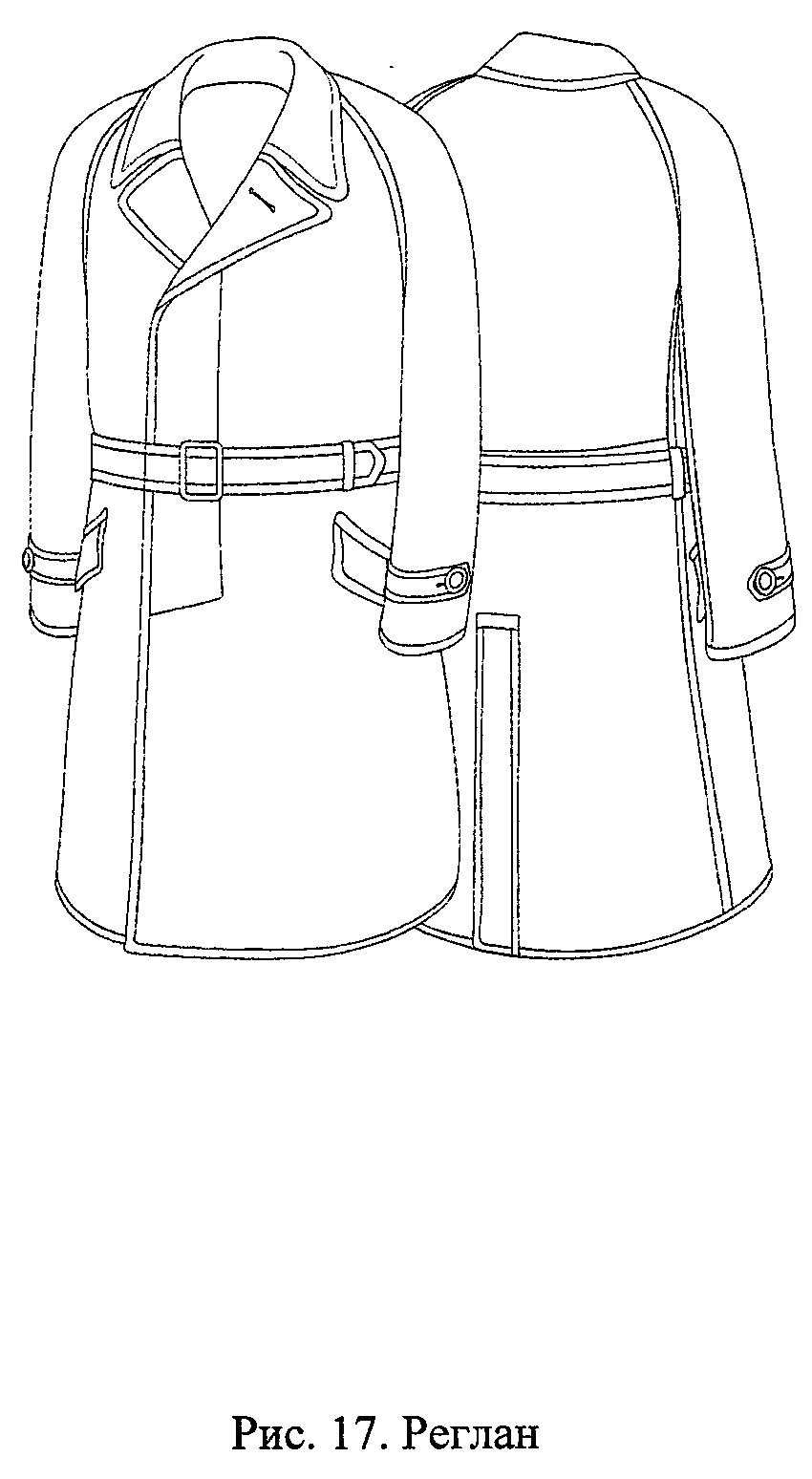 2.19. Реглан из кожи или кожзаменителя черного цвета прямого покроя имеет стояче-отложной воротник, потайную застежку, заднюю шлицу, два боковых прорезных кармана с клапанами и пояс (рис. 17).