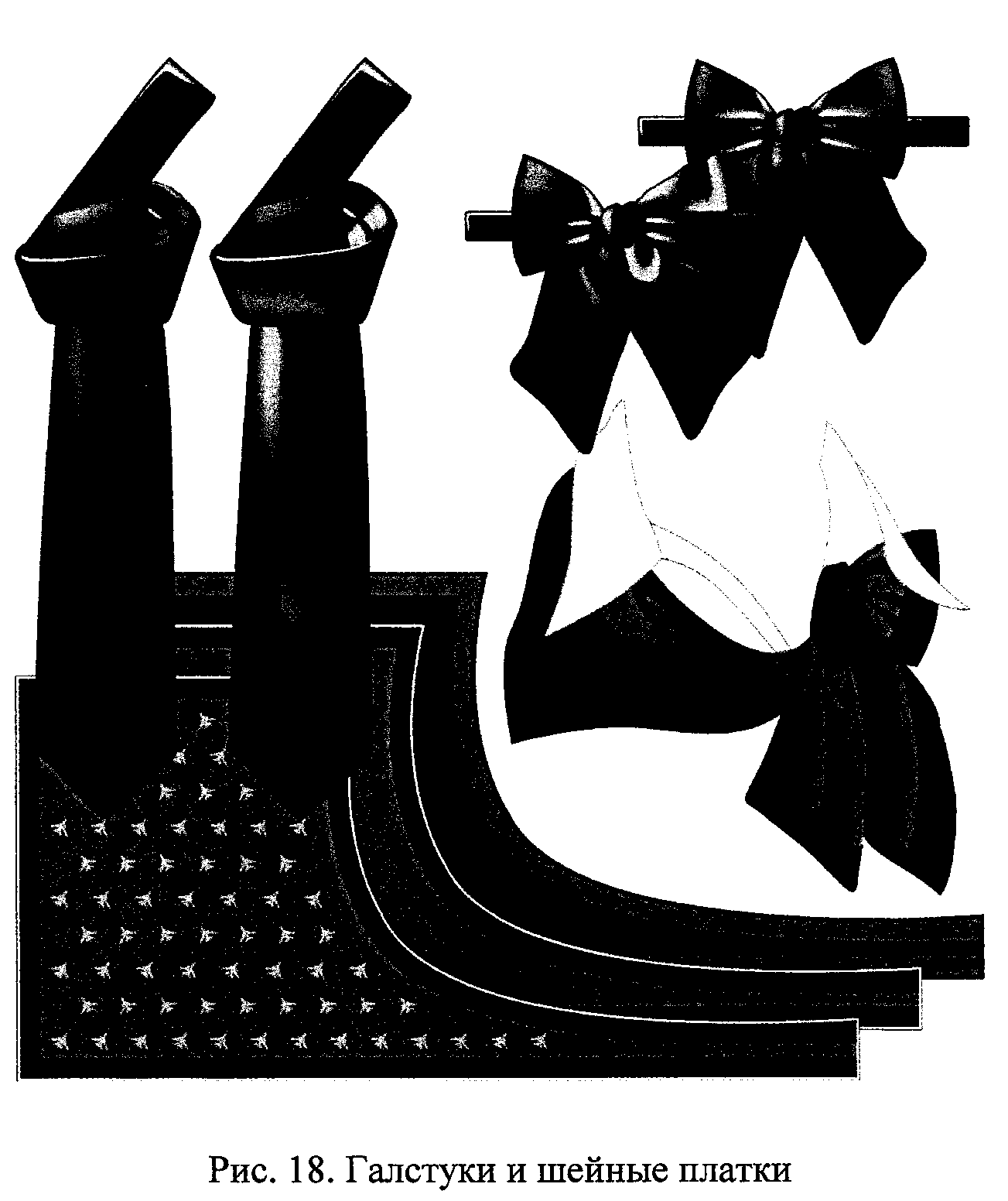 2.21. Дополнительные предметы форменной одежды: синий или черный гладкий галстук (галстук-бант), шейный платок с преобладанием синего и голубого цветов в рисунке (для женщин) (рис. 18), черные перчатки и белое кашне (шелковое или шерстяное).