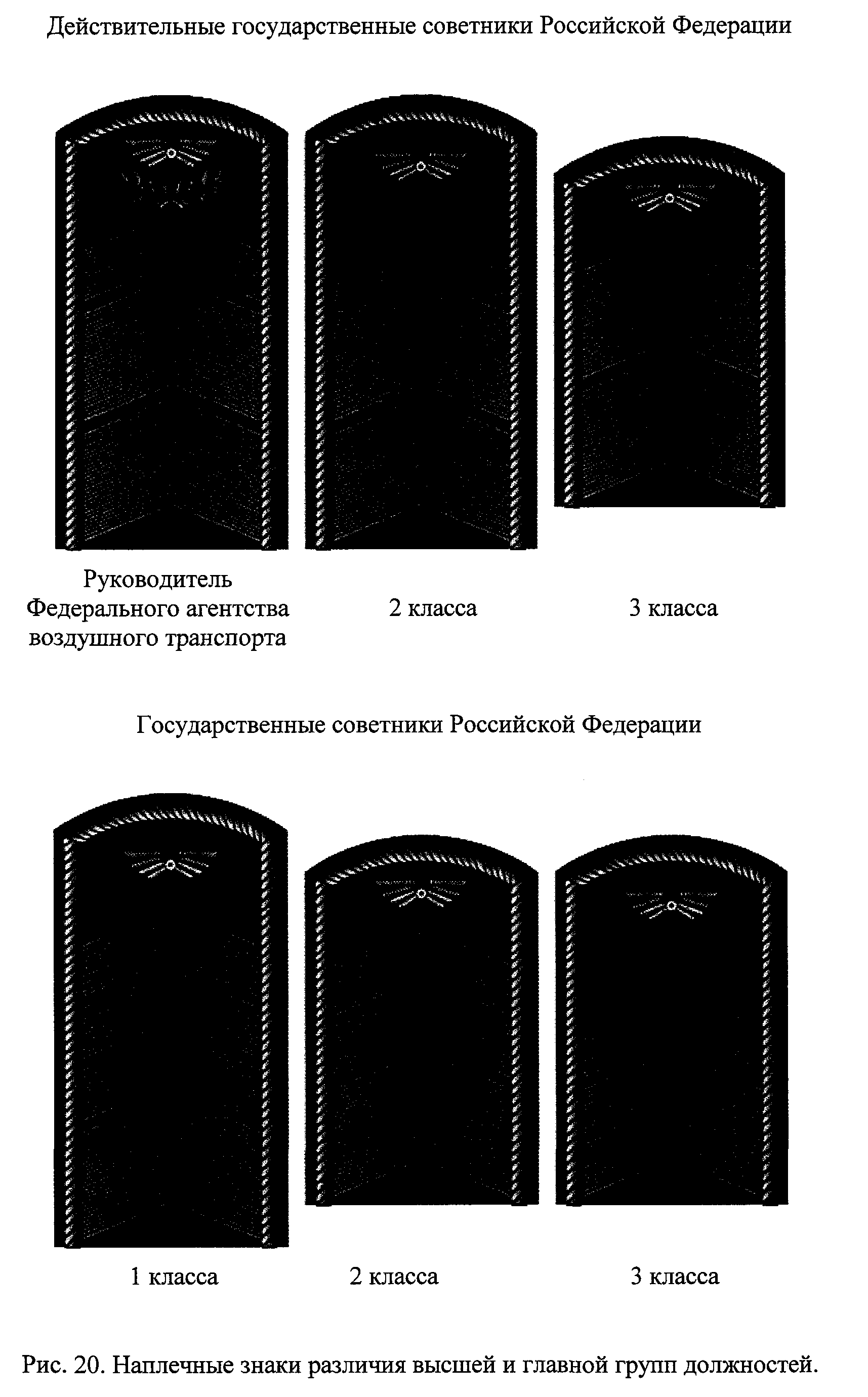| Высшая | Действительный государственный советник Российской Федерации 1 класса | Два широких и два узких галуна, в верхней части - вышитая малая эмблема Росавиации |