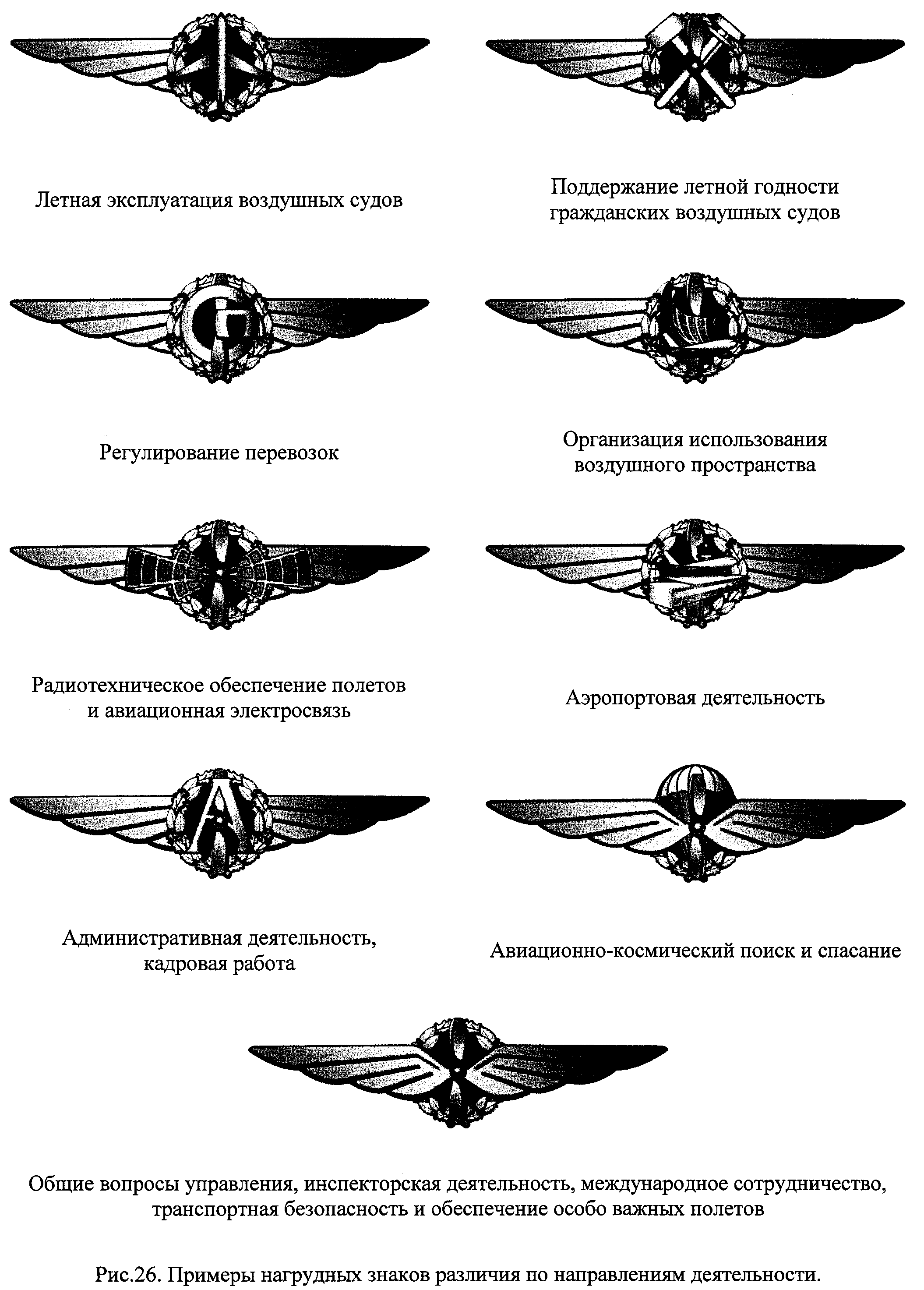 Знак без накладной эмблемы - общие вопросы управления, инспекторская деятельность, международное сотрудничество, транспортная безопасность и обеспечение особо важных полетов.