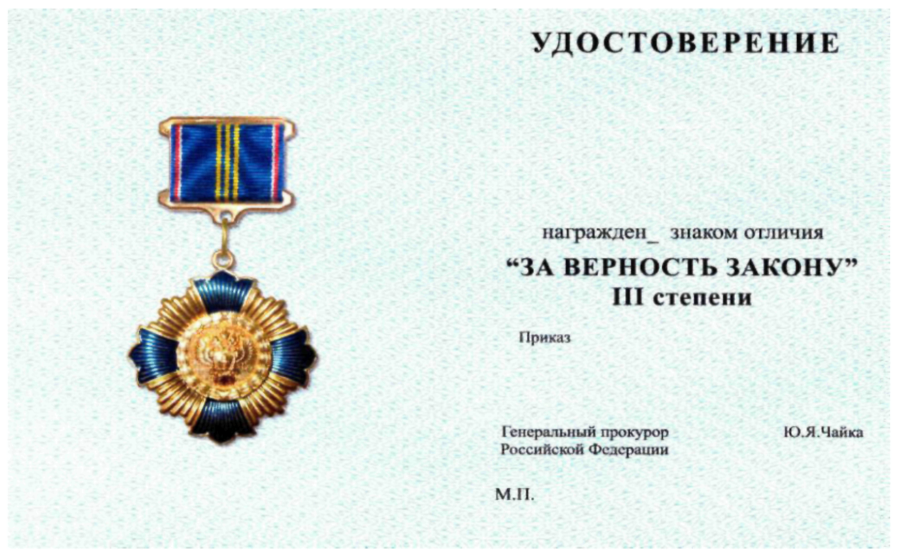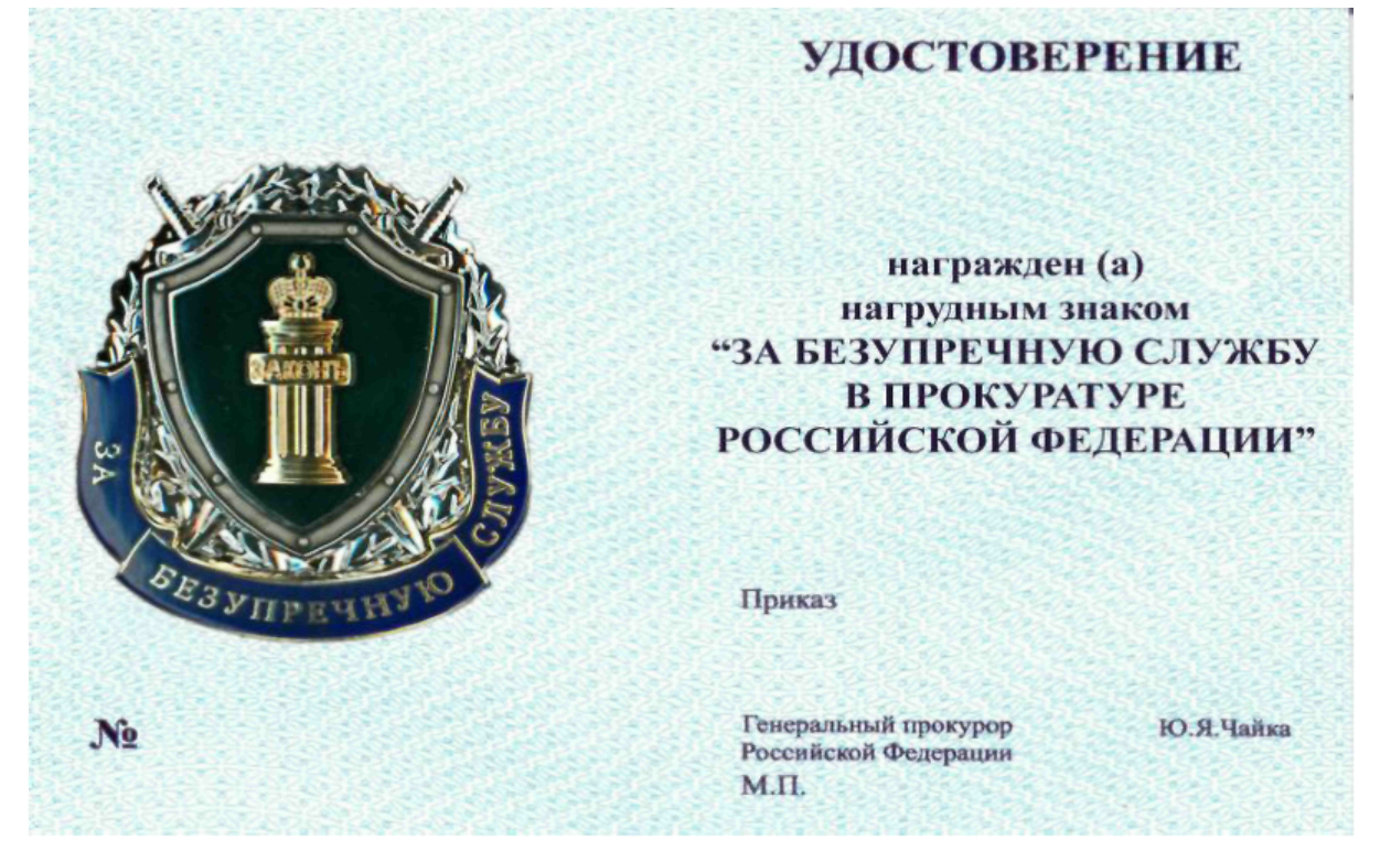 нагрудный знак «За безупречную службу в прокуратуре Российской Федерации»;