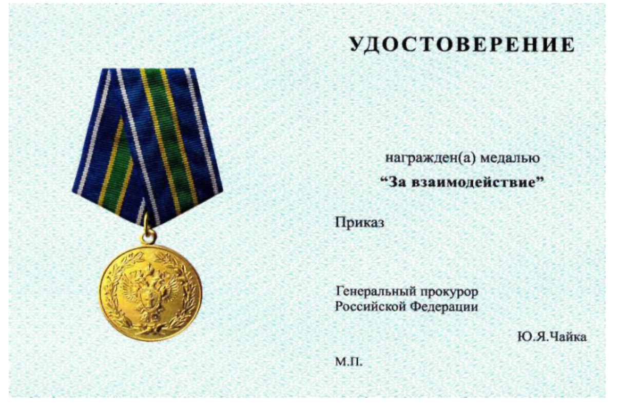 1. Медаль «За взаимодействие» (далее - медаль) является наградой прокуратуры Российской Федерации.