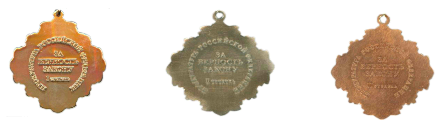 На оборотной стороне расположены рельефные надписи: «ПРОКУРАТУРА РОССИЙСКОЙ ФЕДЕРАЦИИ» - по кругу, «ЗА ВЕРНОСТЬ ЗАКОНУ» - в центре, под ней - указание степени знака отличия.