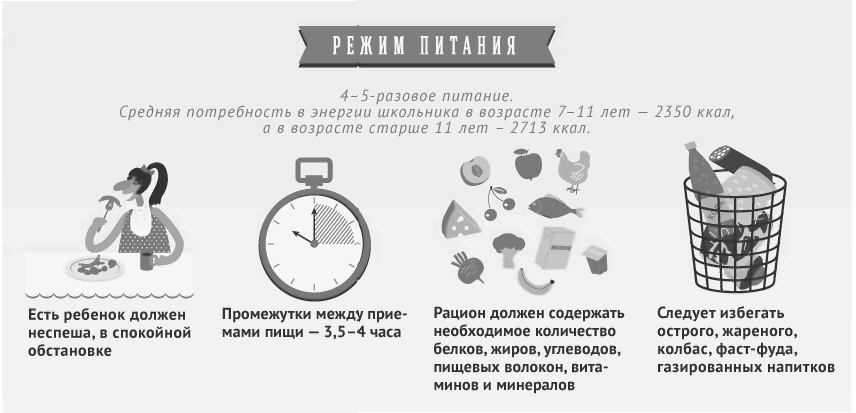 Правильно организованный режим питания основывается на выполнении определённых требований. Прежде всего, это соблюдение времени приёмов пищи и интервалов между ними. Промежутки между приёмами пищи у школьников не должны превышать 3,5-4 часов.