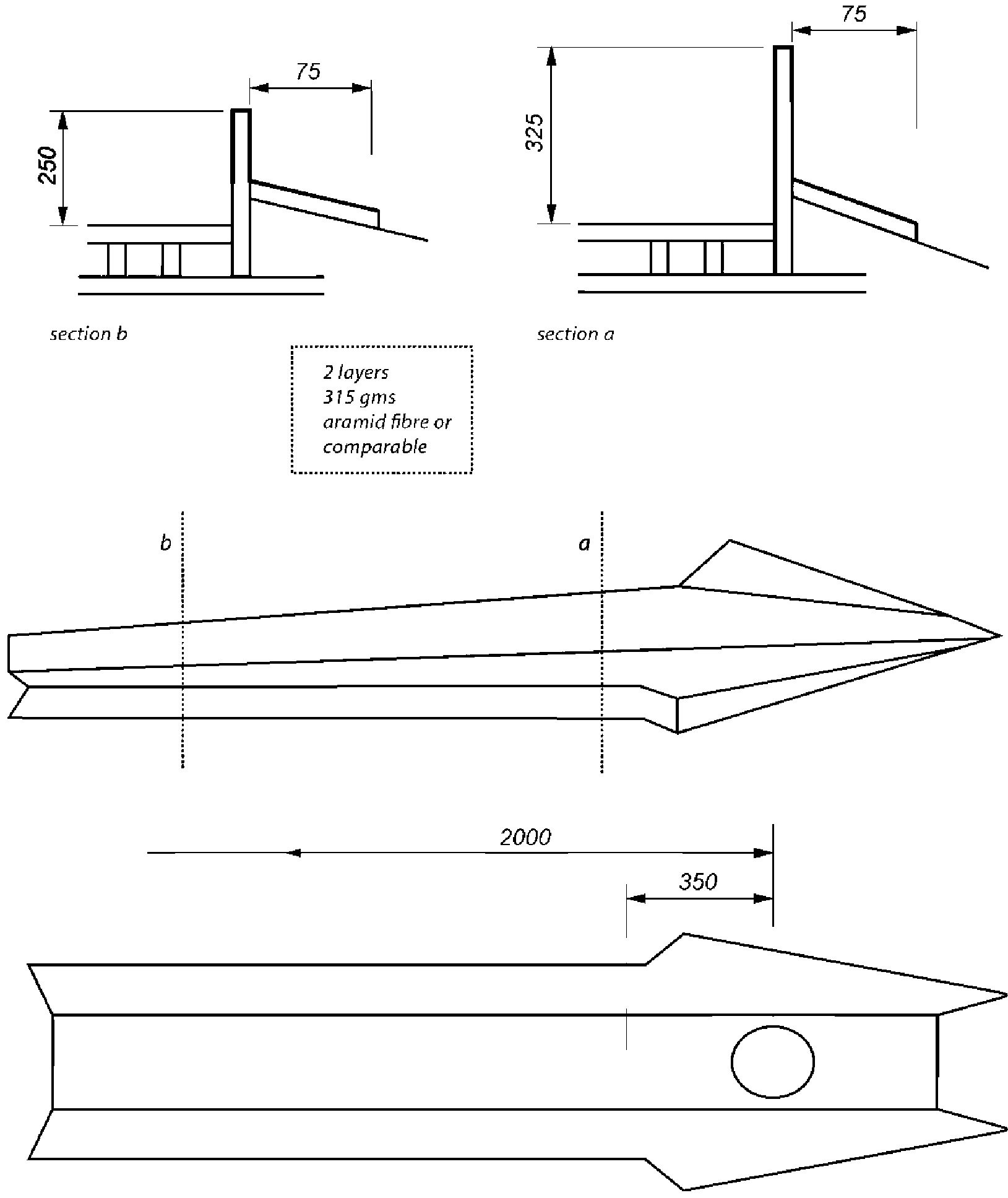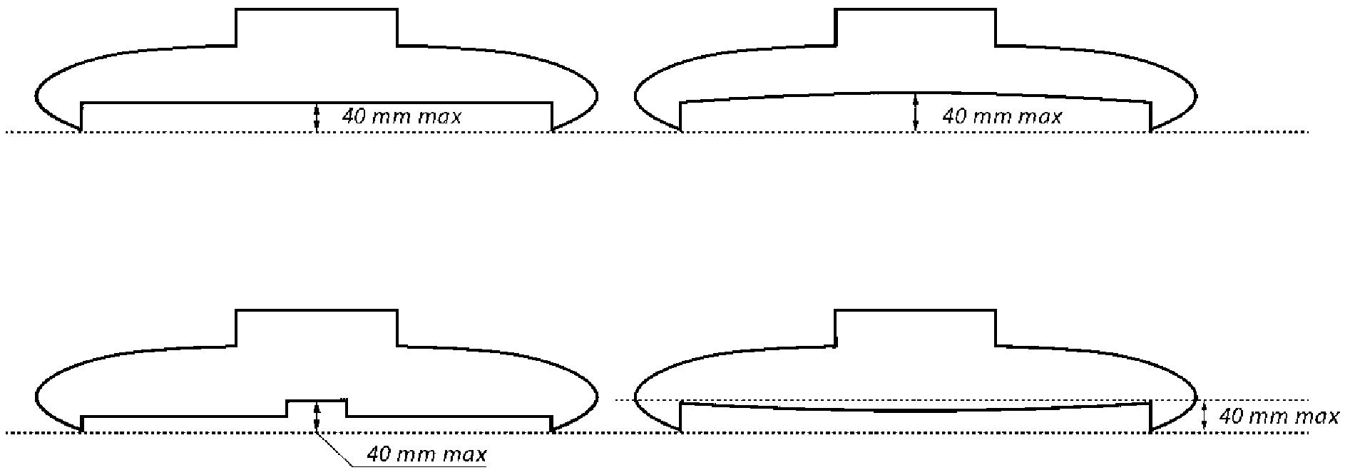 Любые продольные конструктивные элементы по обеим сторонам днища корпуса позади спонсонов, изменяющие структуру воздушного потока, должны иметь высоту, измеренную в районе транцевого шпангоута, не более 40 мм