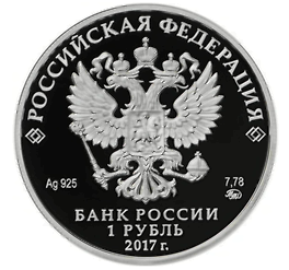 На лицевой стороне монеты расположено рельефное изображение Государственного герба Российской Федерации, имеются надписи: “РОССИЙСКАЯ ФЕДЕРАЦИЯ”, “БАНК РОССИИ”, номинал монеты - “1 РУБЛЬ” и дата - “2017 г.”, обозначение металла по Периодической системе элементов Д.И. Менделеева, проба сплава, товарный знак Московского монетного двора и масса драгоценного металла в чистоте.