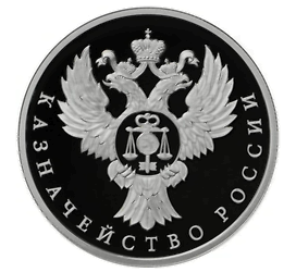 На оборотной стороне монеты расположено рельефное изображение эмблемы Федерального казначейства, внизу по окружности имеется надпись “КАЗНАЧЕЙСТВО РОССИИ”.
