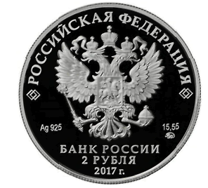 На лицевой стороне монеты расположено рельефное изображение Государственного герба Российской Федерации, имеются надписи: “РОССИЙСКАЯ ФЕДЕРАЦИЯ”, “БАНК РОССИИ”, номинал монеты - “2 РУБЛЯ” и дата - “2017 г.”, обозначение металла по Периодической системе элементов Д.И. Менделеева, проба сплава, товарный знак Московского монетного двора и масса драгоценного металла в чистоте.
