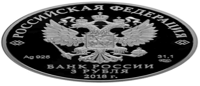 На лицевой стороне монет расположено рельефное изображение Государственного герба Российской Федерации, имеются надписи: "РОССИЙСКАЯ ФЕДЕРАЦИЯ", "БАНК РОССИИ", номинал монет -"3 РУБЛЯ" и дата - "2018 г.", обозначение металла по Периодической системе элементов Д.И. Менделеева, проба сплава, товарный знак Санкт-Петербургского монетного двора и масса драгоценного металла в чистоте.