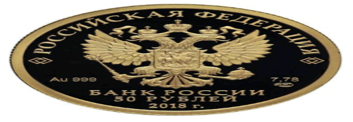 На лицевой стороне монеты расположено рельефное изображение Государственного герба Российской Федерации, имеются надписи: "РОССИЙСКАЯ ФЕДЕРАЦИЯ", "БАНК РОССИИ", номинал монеты - "50 РУБЛЕЙ" и дата - "2018 г.", обозначение металла по Периодической системе элементов Д.И. Менделеева, проба, товарный знак Санкт-Петербургского монетного двора и масса драгоценного металла в чистоте.