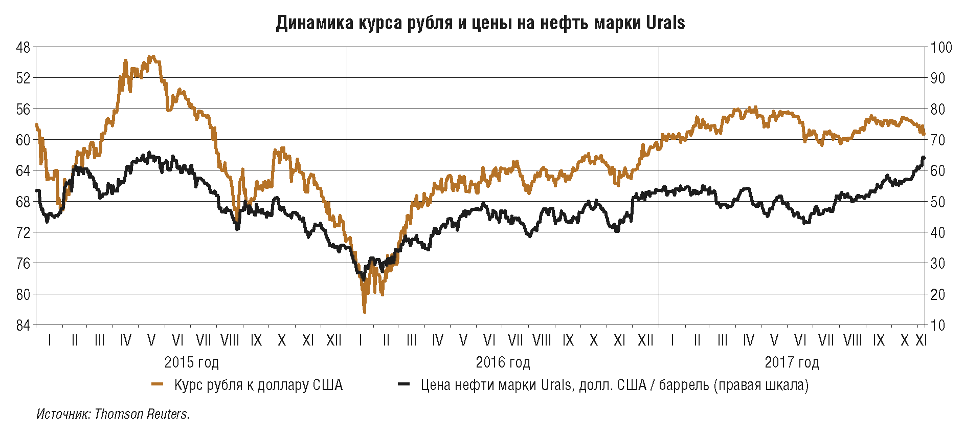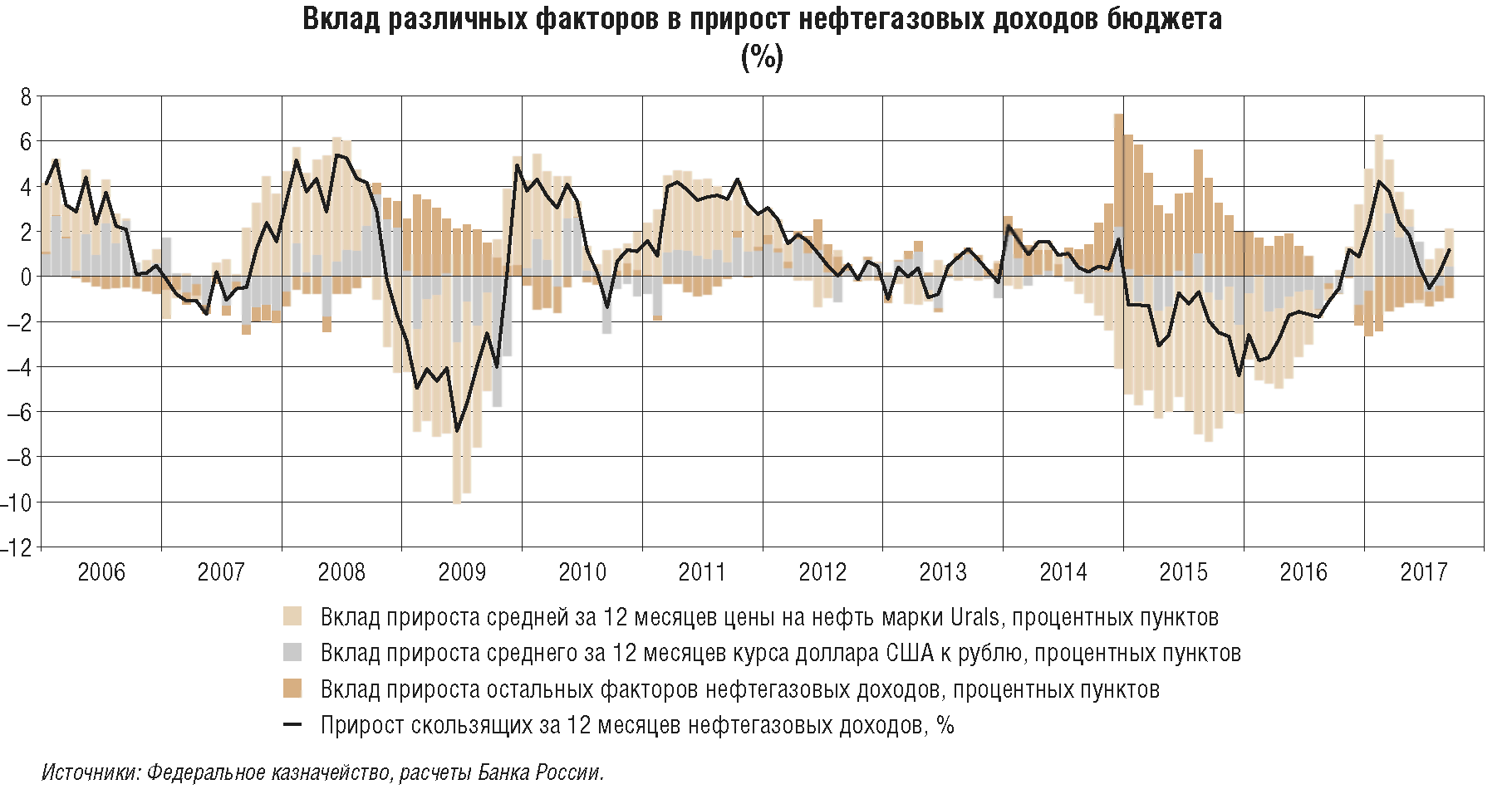 Тенденция к укреплению рубля, которая преобладала в январе-сентябре 2017 г., в основном сформировалась под влиянием фундаментальных факторов, определяющих спрос на национальную валюту через спрос на товары, услуги и финансовые активы страны. Основными факторами укрепления рубля в 2017 г. были повышательная динамика цен на нефть и сопутствующий приток валютной выручки экспортеров, а также сохранение существенного положительного дифференциала процентных ставок внутри страны и за рубежом, что наряду со значительным улучшением ситуации в российской экономике способствовало повышению привлекательности России для инвесторов. Эпизоды краткосрочного и небольшого отклонения курса рубля от фундаментального в сторону укрепления под влиянием настроений и ожиданий на глобальных рынках, а также внутригодовых колебаний объемов продаж валютной выручки экспортерами не оказывали значимого влияния на внутренние условия в финансовом и реальном секторах.