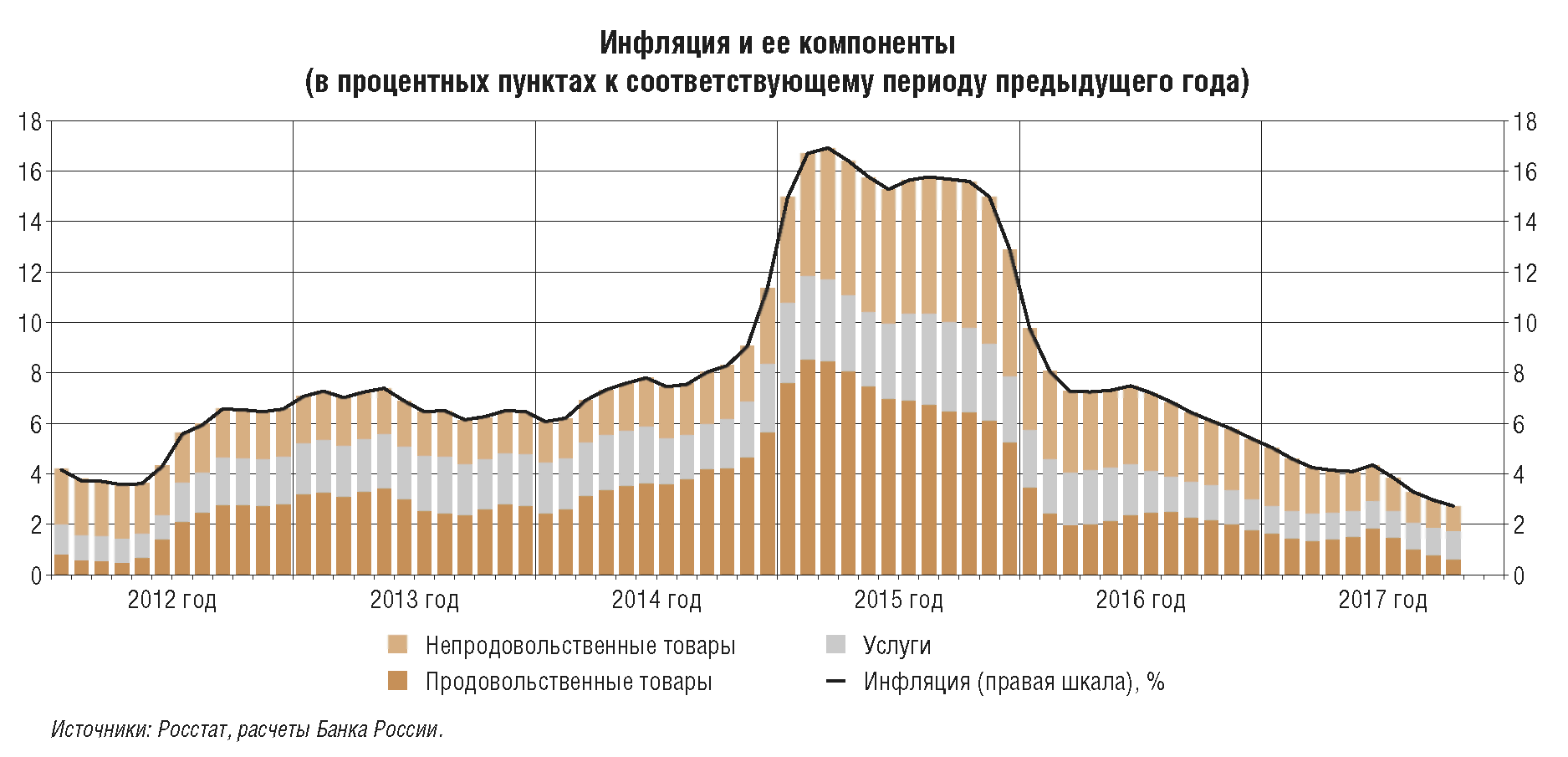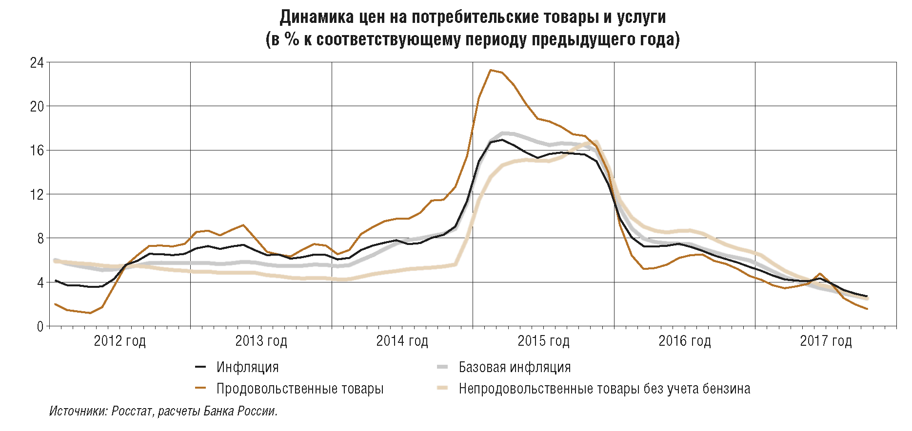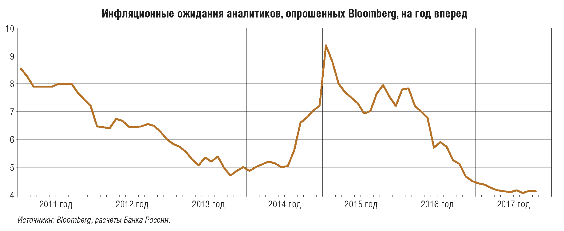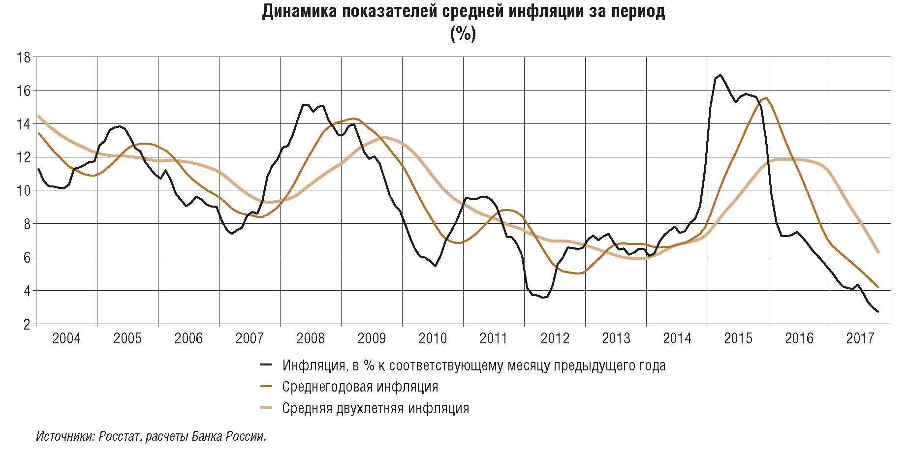 В предыдущие два года Банк России обеспечил снижение инфляции с двузначных уровней до цели 4%, проводя умеренно жесткую денежно-кредитную политику. В течение большей части 2017 г. темпы прироста потребительских цен уже находятся вблизи 4%. Но по сути это только начало пути к обеспечению ценовой стабильности, когда цель по инфляции 4% станет надежным ориентиром для всех участников экономических отношений. На это требуется достаточно длительное время, что, в частности, подтверждает опыт других стран.