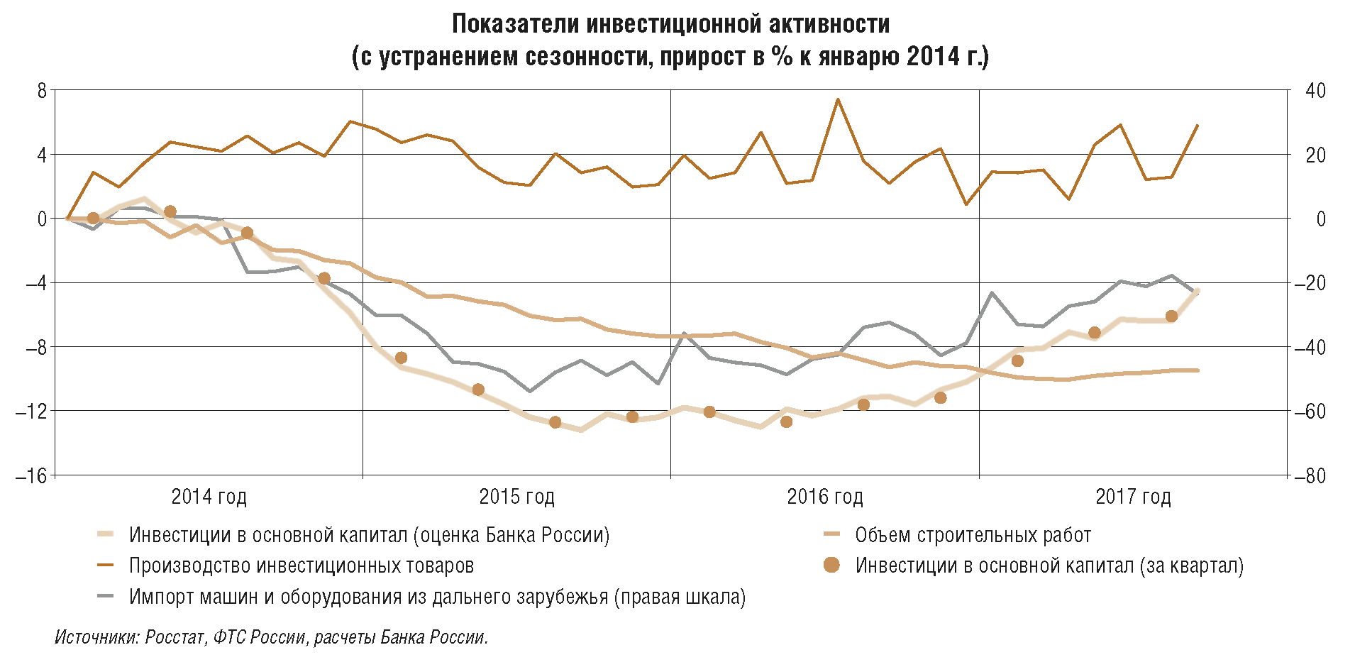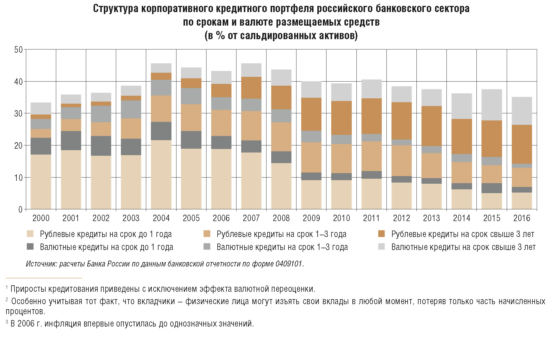 В период мощных внешних шоков, продолжавшихся вплоть до I квартала 2016 г., для Банка России на первом плане стояла задача обеспечения финансовой стабильности наряду со снижением инфляции с высоких уровней, при этом не допуская чрезмерного охлаждения российской экономики. По мере стабилизации ситуации, адаптации экономики к негативным внешним условиям, проявления восстановительных процессов в 2016 г. Банк России в основном мог сконцентрироваться на задаче снижения инфляции и закрепления ее вблизи 4%. Задачи сохранения финансовой стабильности и оценка рисков экономического спада оставались объектом пристального внимания Банка России, но они уже не стояли настолько остро, как в предыдущие два года.
