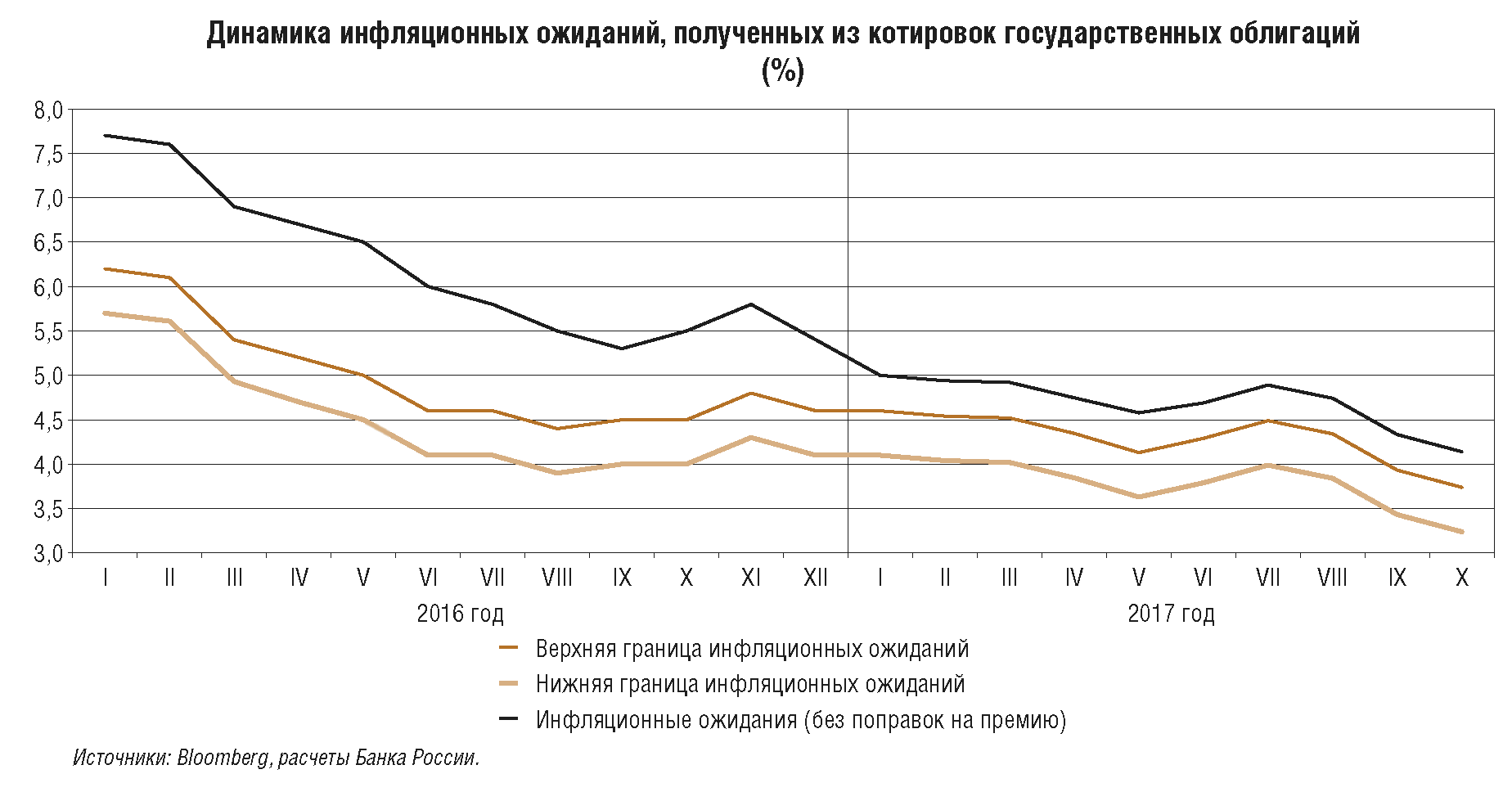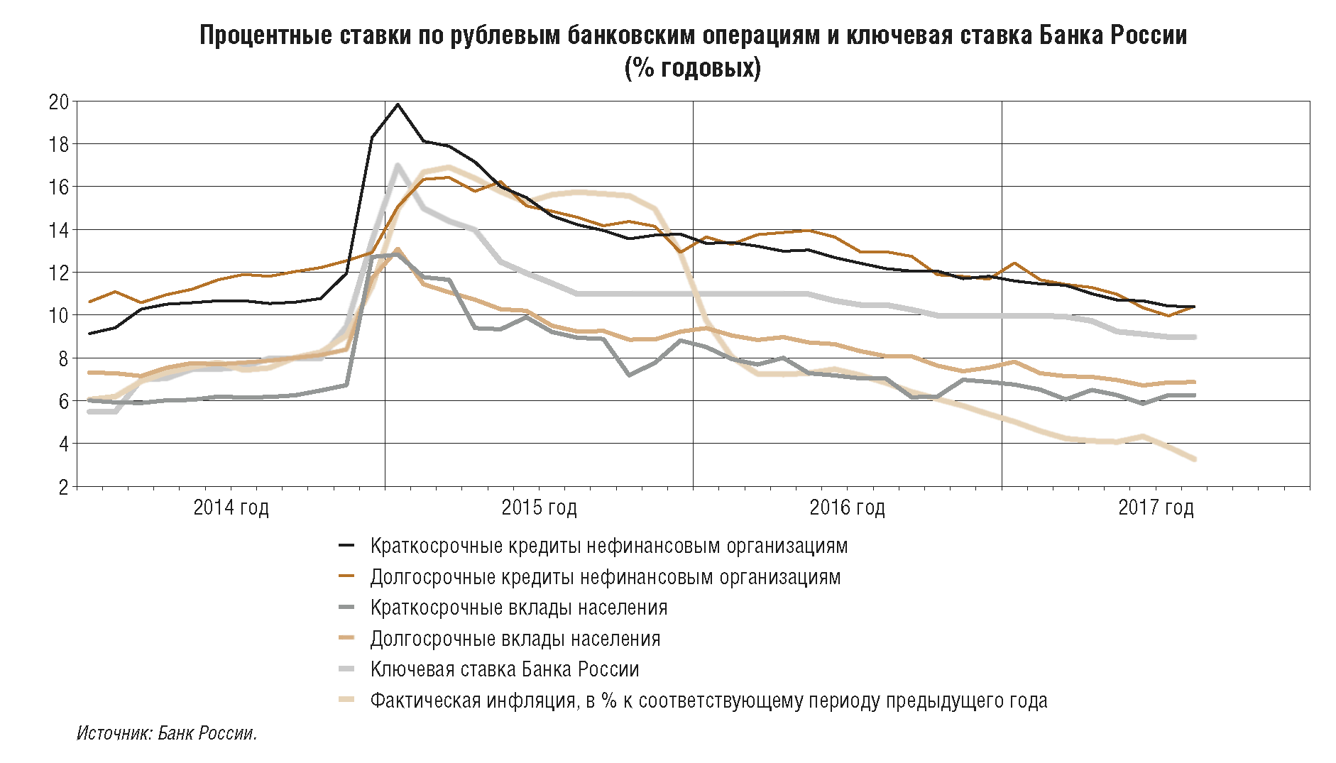 В 2017 г. Банк России проводит денежно-кредитную политику, следуя принципам, заявленным ранее в Основных направлениях единой государственной денежно-кредитной политики, и учитывая складывающиеся экономические тенденции.