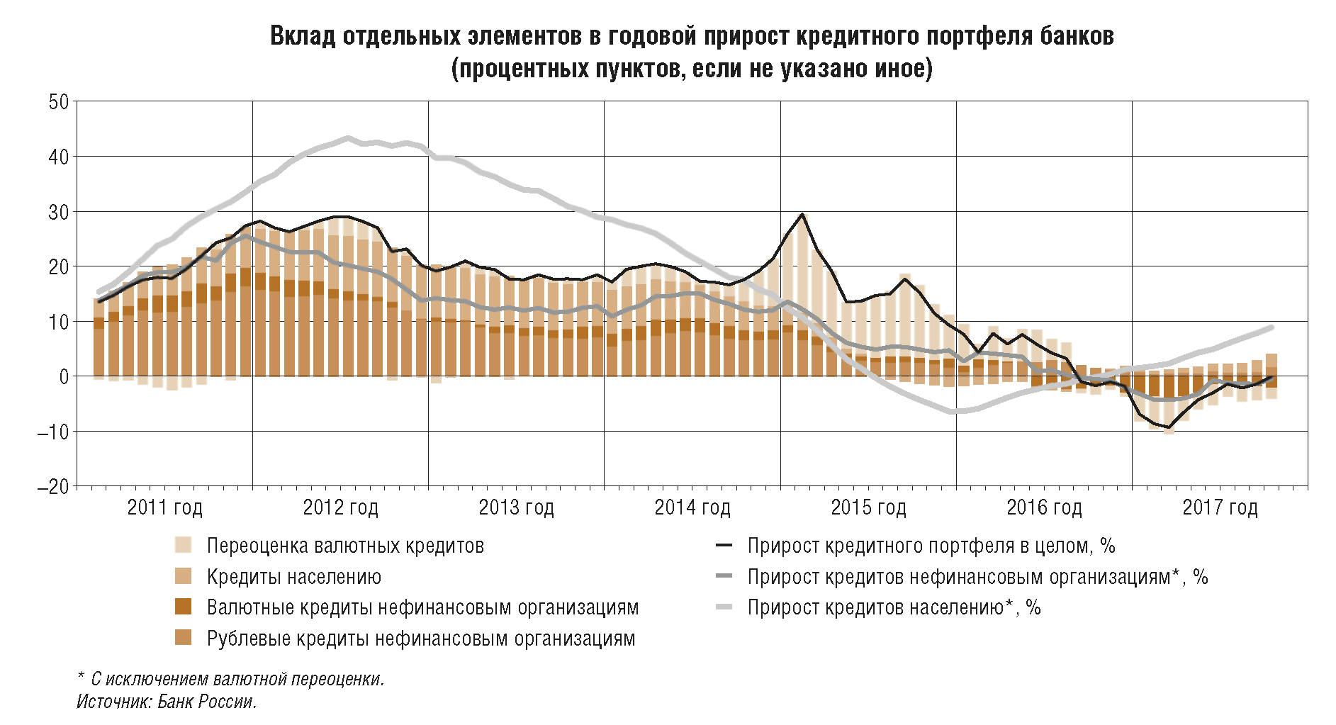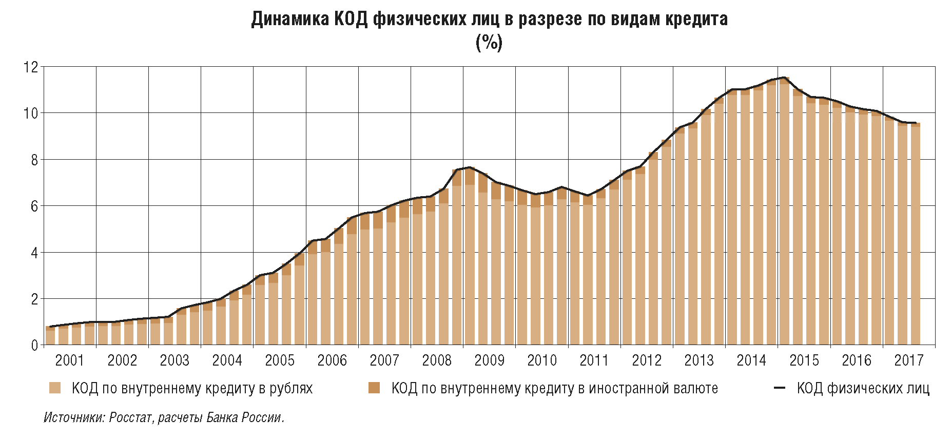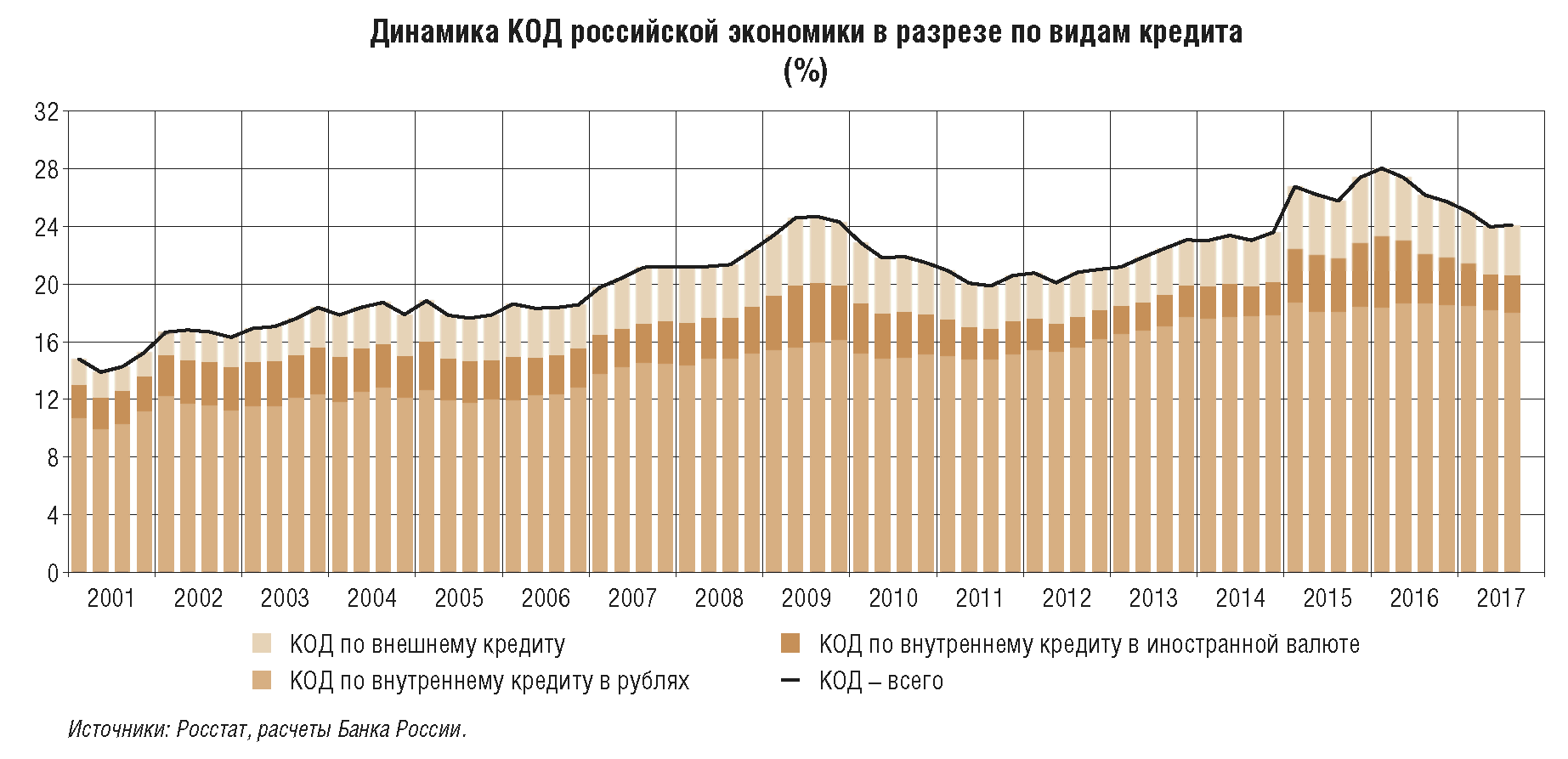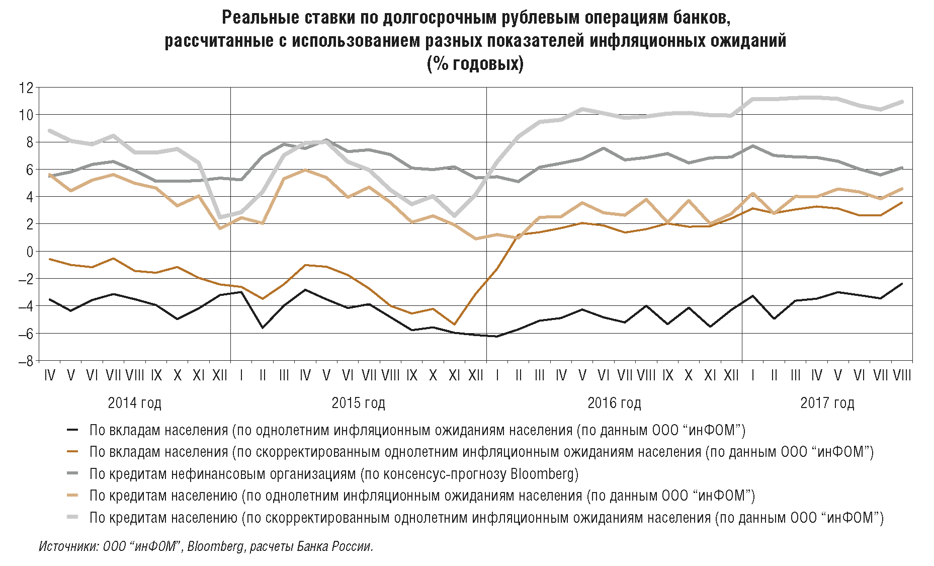 Еще одной особенностью формирования денежно-кредитных условий в 2017 г., как и в 2016 г., является сохраняющийся консервативный подход участников финансового рынка к оценке рисков и, соответственно, низкая склонность к риску кредиторов и заемщиков. Банки продолжали проводить жесткий отбор заемщиков (смягчая неценовые условия кредитования довольно медленно). Заемщики, в свою очередь, избегали чрезмерного наращивания долговой нагрузки, накопленный уровень которой оставался относительно высоким как для экономики в целом, так и для компаний реального сектора (приложение 8). Домашние хозяйства в основном придерживались сберегательной модели, чему способствовали положительные реальные процентные ставки, а начавшееся в 2017 г. увеличение потребления в основном происходило за счет роста доходов. Перечисленные факторы, наряду с умеренно жесткой денежно-кредитной политикой, формировали условия для сдержанного восстановления кредитной активности, не приводящей к формированию рисков в реальном и финансовом секторах, а также инфляционного давления. На текущем этапе консерватизм участников экономических отношений во многом оправдан и создает предпосылки для сбалансированного восстановления экономики и закрепления инфляции вблизи 4%.