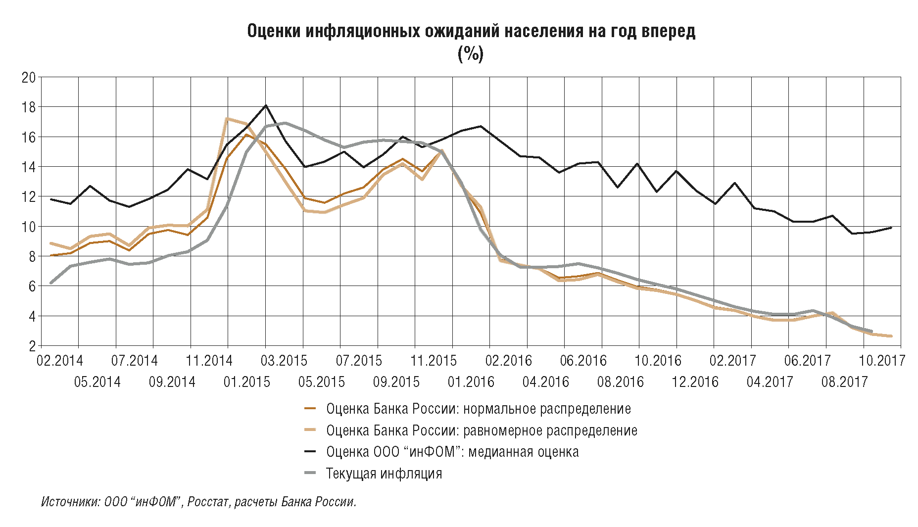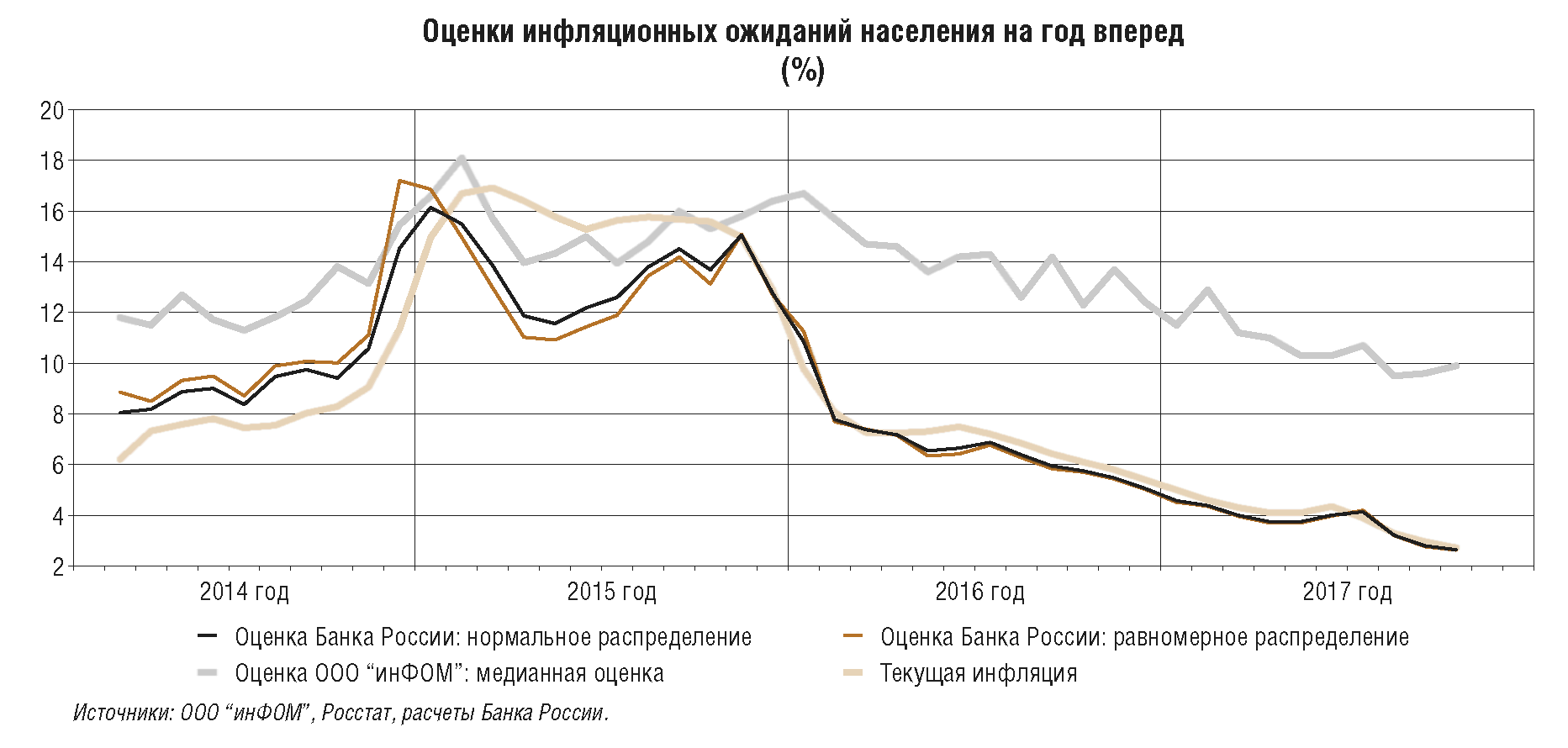 При этом сохранение повышенных инфляционных ожиданий как предприятий, так и домашних хозяйств, а также их чувствительность к проинфляционным факторам показывают, что среди участников экономических отношений все еще не сформировалась уверенность в том, что инфляция снизилась устойчиво и надолго. Поэтому ключевой задачей Банка России на текущем этапе, а также в период 2018-2020 гг. является закрепление темпов роста потребительских цен вблизи 4%, а также формирование доверия к проводимой денежно-кредитной политике. Низкие и стабильные темпы роста цен должны стать неотъемлемой частью экономических условий, а годовая инфляция 4% - надежным ориентиром при принятии решений и построении планов населением, банками и бизнесом.