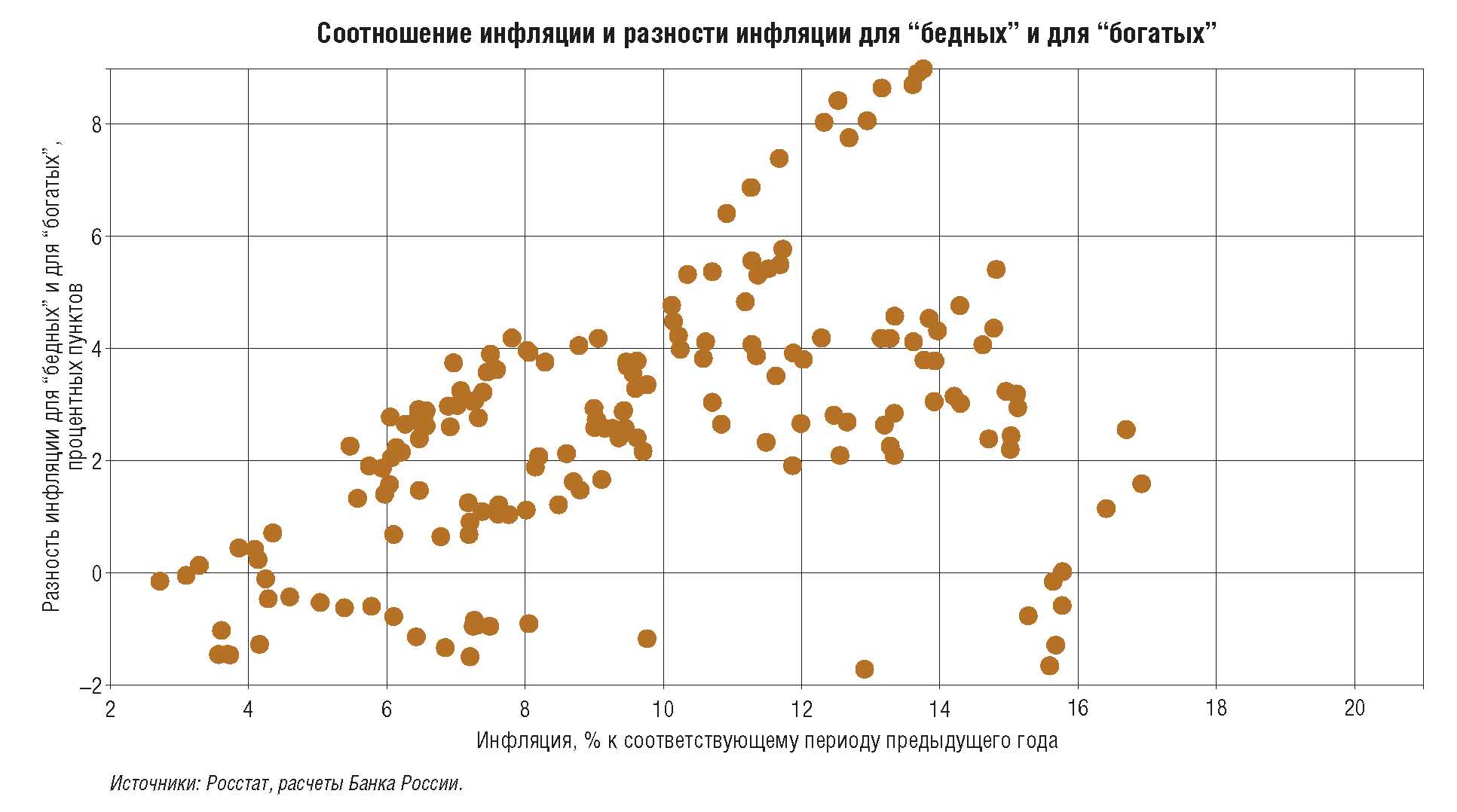 Следует также отметить, что потребительская корзина и темпы изменения ее стоимости индивидуальны для каждого домашнего хозяйства. Доля различных продуктов и услуг в потреблении может заметно различаться для разных групп населения - по возрасту, семейному положению, доходу, месту проживания. Эти локальные и индивидуальные различия в динамике цен не противоречат задаче поддержания ценовой стабильности, поскольку они имеют небольшие масштабы и не отражаются в существенном отклонении годового показателя инфляции по России в целом от 4%. Более того, по мере закрепления инфляции вблизи 4% и стабилизации инфляционных ожиданий на низких уровнях масштаб различий в динамике цен по товарным группам и регионам будет постепенно снижаться.
