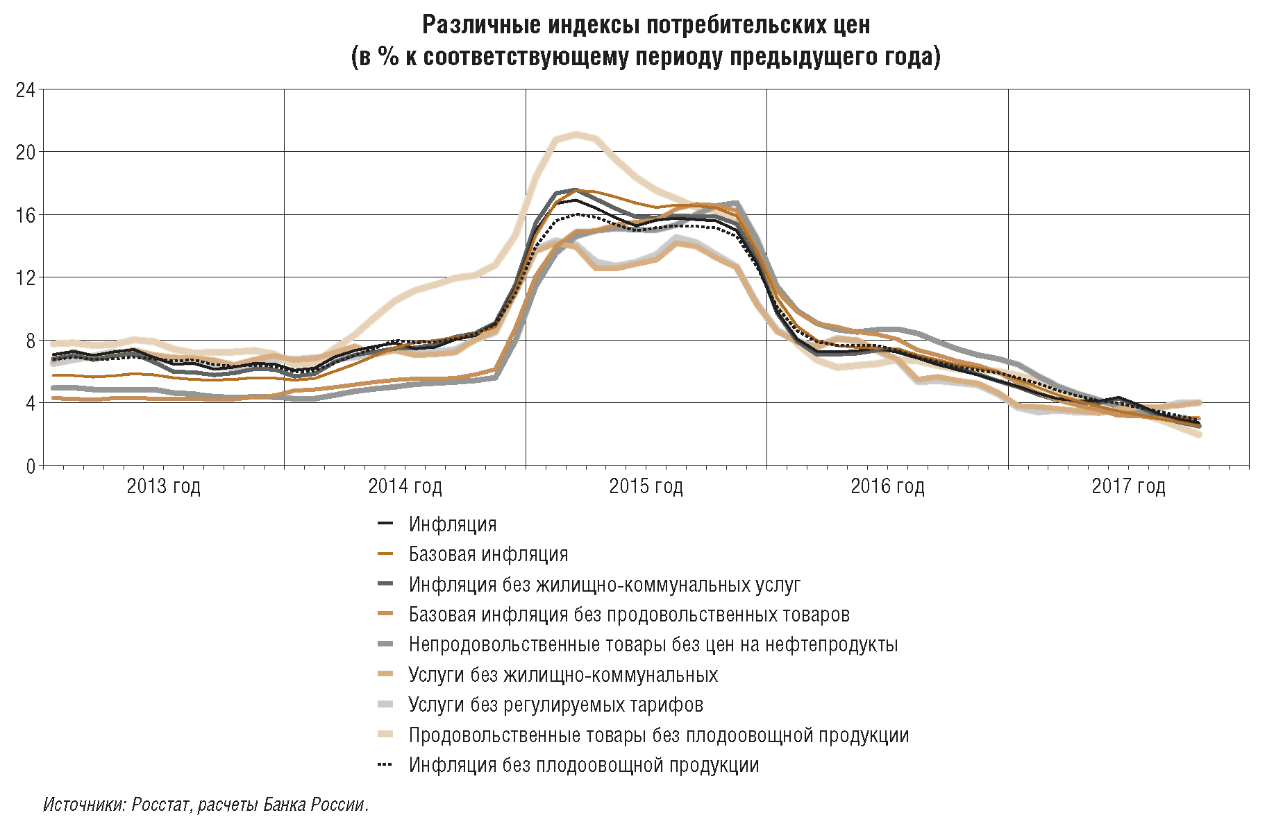 Банк России проводит регулярный мониторинг широкого круга ценовых показателей, рассматривая различные компоненты и группы компонентов потребительской корзины, исследует их динамику за различные периоды времени: месяц, квартал, год. Для оценки устойчивости тех или иных процессов в динамике цен анализируется базовая инфляция и ее модификации, то есть ценовые индексы, из состава которых исключены товары с часто и существенно изменяющимися ценами. В этих же целях проводится анализ усредненных за разные периоды индикаторов инфляции (подробнее см. приложение 5).