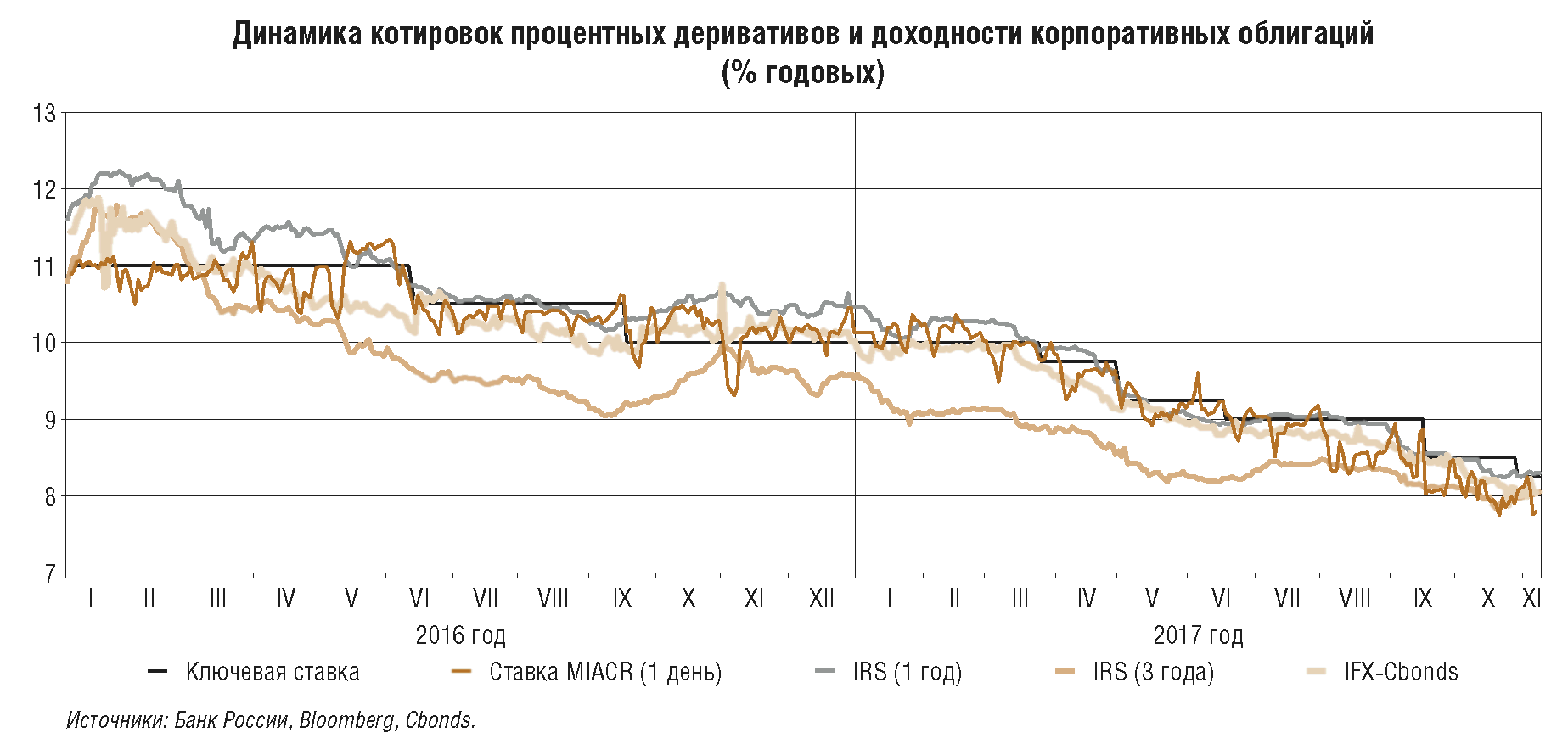 Изменение краткосрочных ставок денежного рынка вслед за ключевой ставкой с разной скоростью и в разных пропорциях транслируется в процентные ставки по операциям на более длительные сроки во всех сегментах финансового рынка. При этом их динамика также в значительной мере зависит от ожиданий участников рынка в отношении дальнейшего движения ключевой ставки, которые в том числе формируются под влиянием риторики центрального банка. В 2017 г. заметно возросла роль информационных сигналов Банка России, их влияние на процентные ставки по операциям на длительные сроки усилилось. В IV квартале 2016 г. и в первые месяцы 2017 г. при сохранении ключевой ставки неизменной сформировались ожидания ее уменьшения под воздействием соответствующих информационных сигналов в пресс-релизах по итогам заседания Совета директоров Банка России. Это отражалось в котировках процентных деривативов*(12), которые плавно снижались под влиянием изменения ожиданий. В том же направлении корректировалась и доходность облигаций, что влияло на стоимость привлечения средств корпоративными заемщиками.