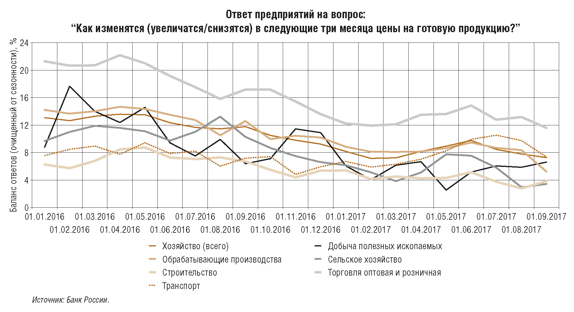 Банк России также учитывал косвенное влияние динамики цен на энергоносители, которое проявляется в изменении цен производителей в добыче полезных ископаемых. Это, в свою очередь, влияет на цены производителей в перерабатывающих отраслях, в том числе под воздействием изменения затрат на топливо, энергию, сырье, что с течением времени переносится в потребительские цены. Увеличение цен производителей в добыче полезных ископаемых в начале 2017 г. под влиянием роста цен на нефть в результате заключения соглашений об ограничении добычи привело к некоторому росту давления на потребительские цены со стороны издержек, но его вклад в годовую инфляцию, по оценкам, небольшой - до 0,2 процентного пункта в сентябре 2017 г., что существенно меньше дезинфляционного вклада укрепления рубля.