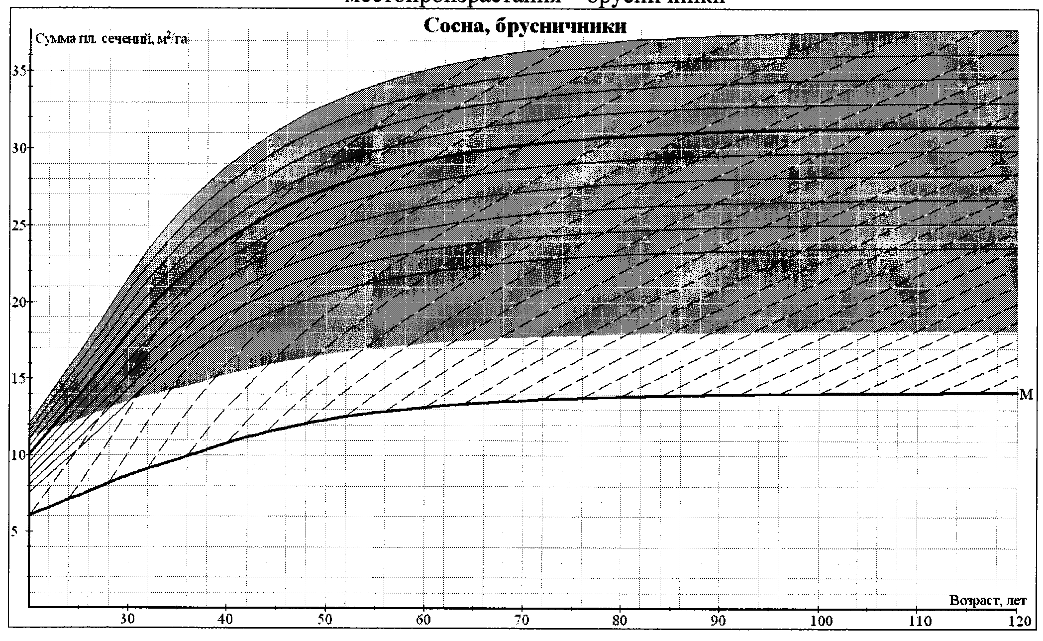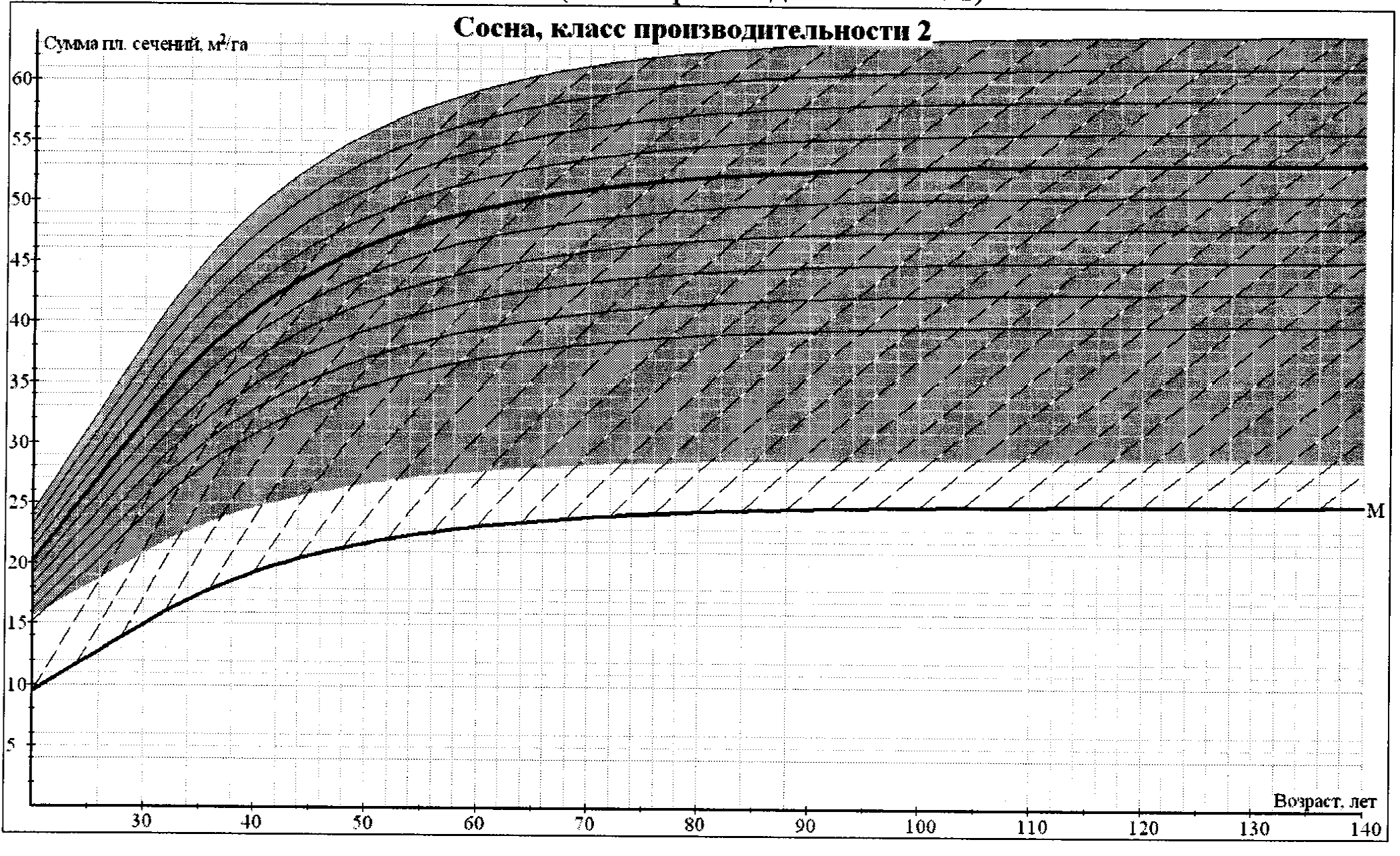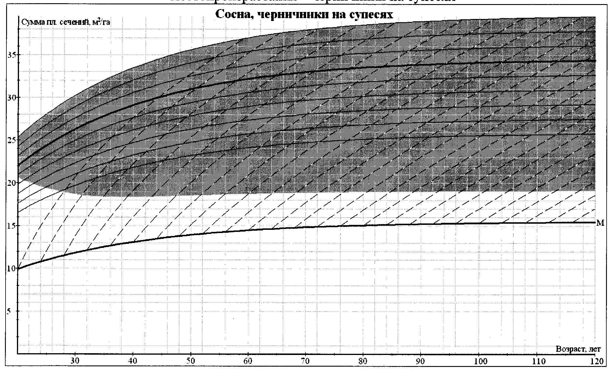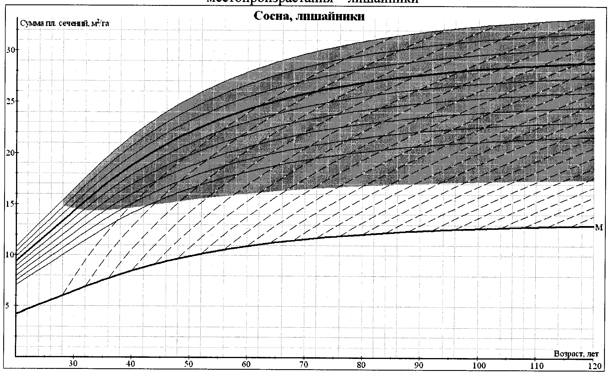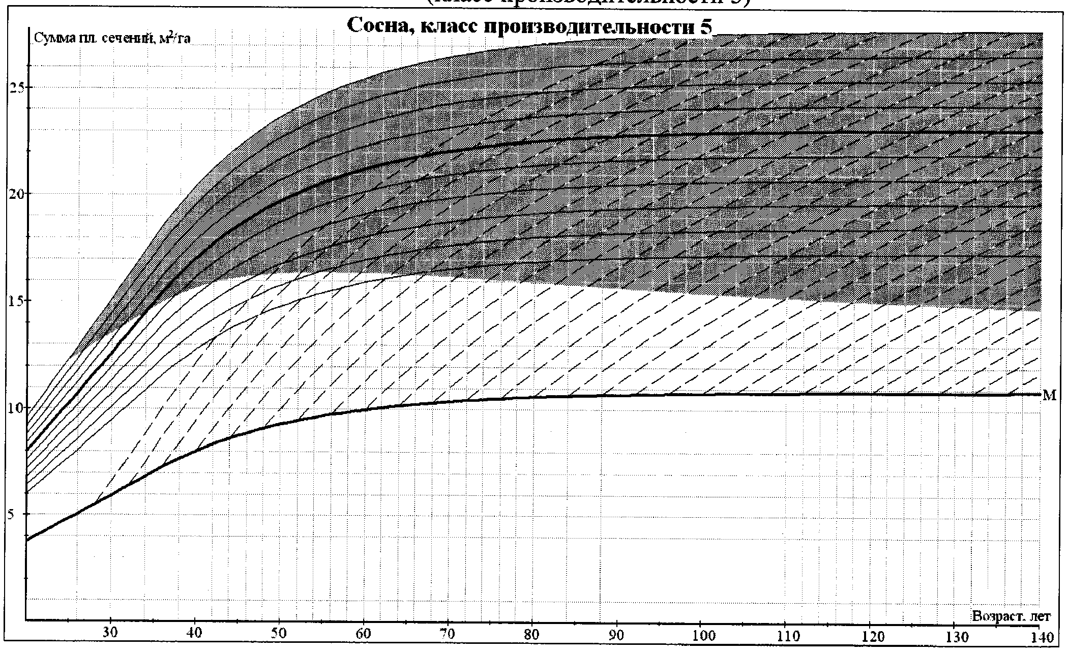 Нижняя сплошная толстая линия, обозначенная буквой М, указывает минимально допустимую абсолютную полноту древостоя после изреживания. Изреживание до этой полноты обеспечивает максимальный прирост древостоя. На основе минимально допустимого значения абсолютной полноты проводится контроль изреживания по абсолютной полноте.