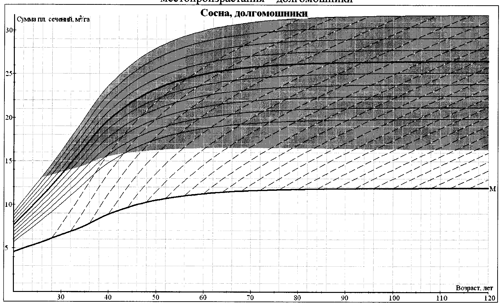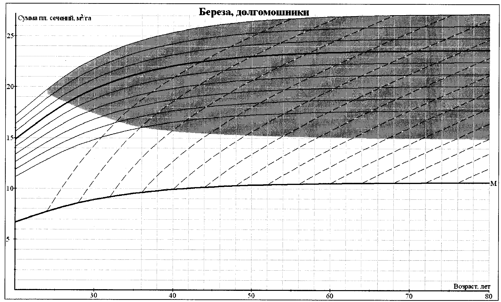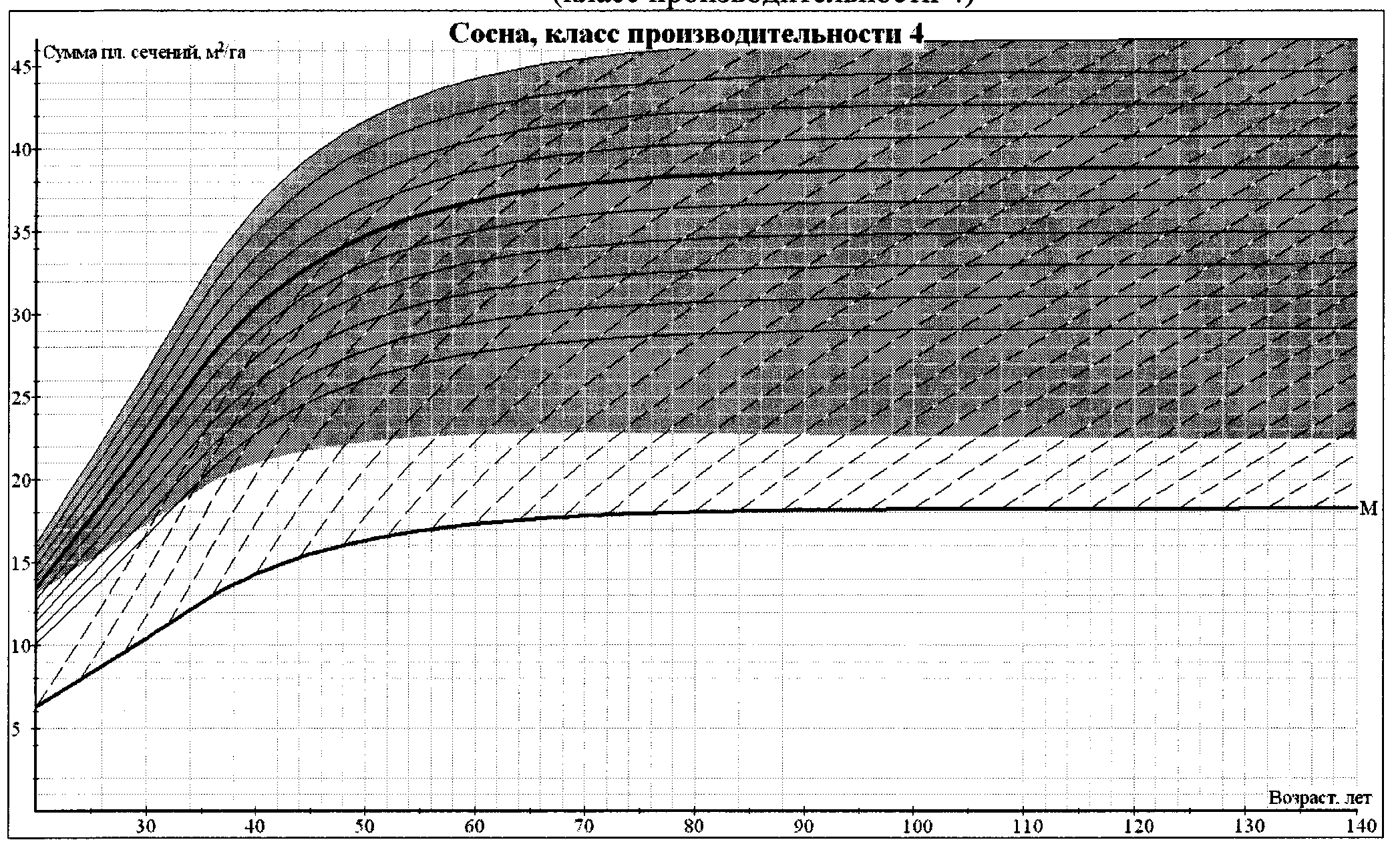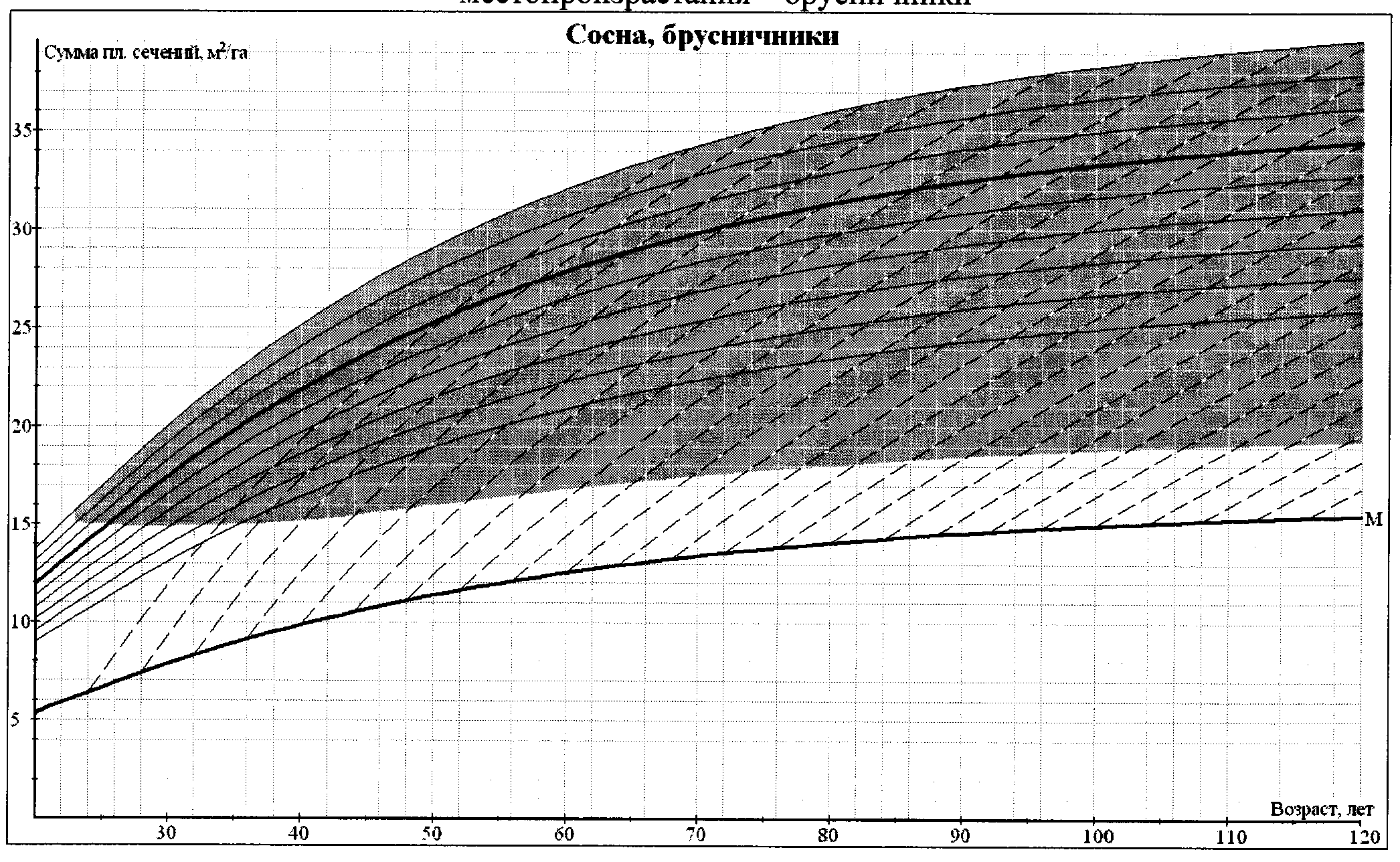 Нижняя сплошная толстая линия, обозначенная буквой М, указывает минимально допустимую абсолютную полноту древостоя после изреживания. Изреживание до этой полноты обеспечивает максимальный прирост древостоя. На основе минимально допустимого значения абсолютной полноты проводится контроль изреживания по абсолютной полноте.