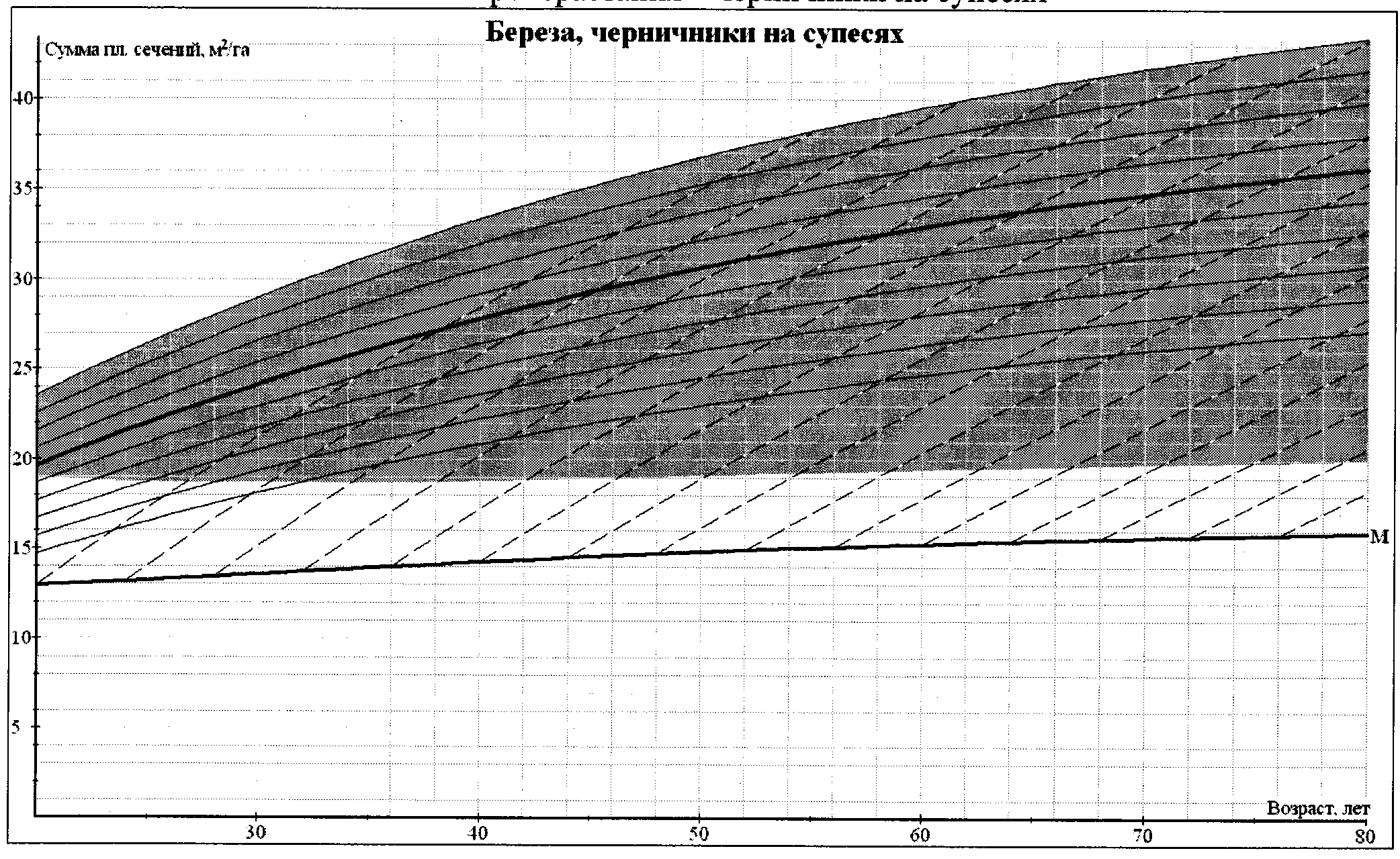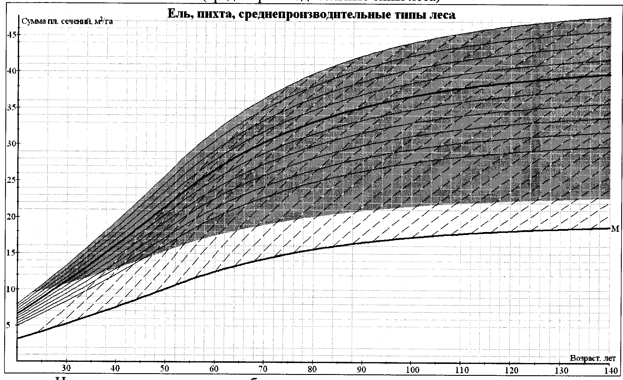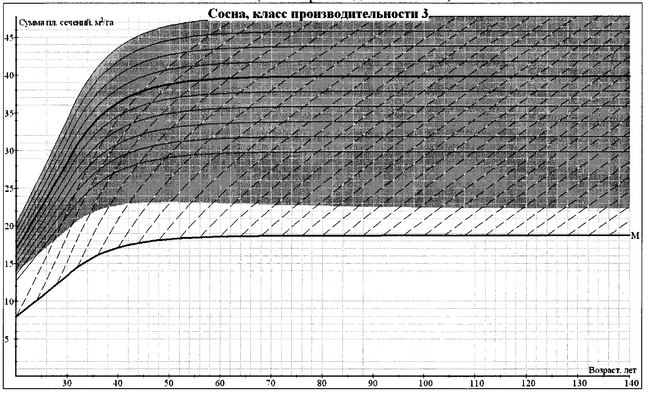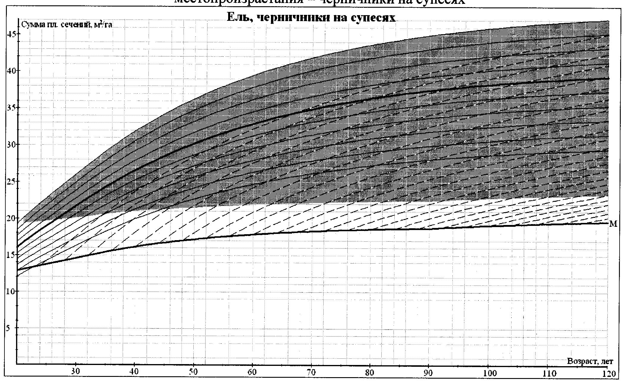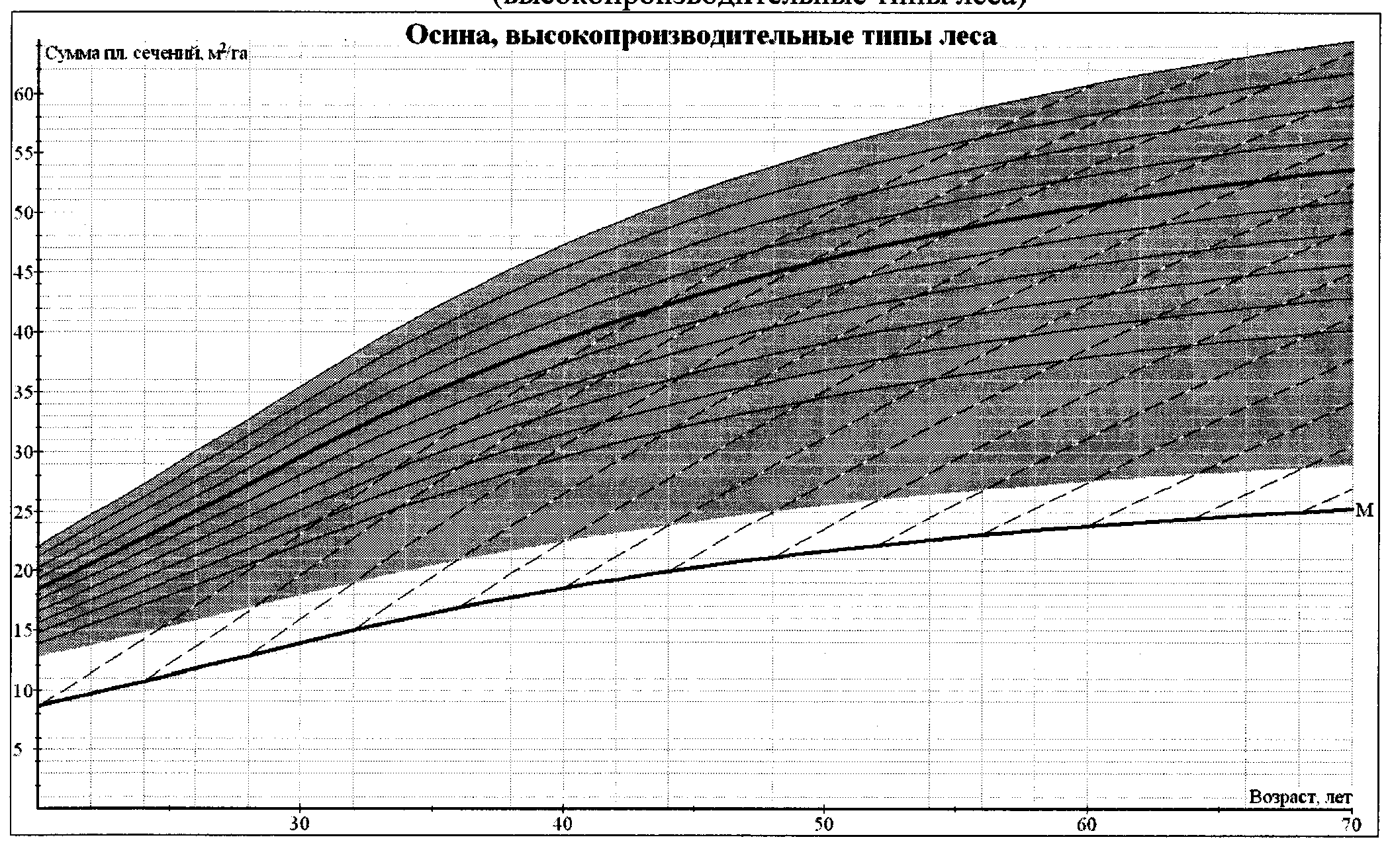 Нижняя сплошная толстая линия, обозначенная буквой М, указывает минимально допустимую абсолютную полноту древостоя после изреживания. Изреживание до этой полноты обеспечивает максимальный прирост древостоя. На основе минимально допустимого значения абсолютной полноты проводится контроль изреживания по абсолютной полноте.